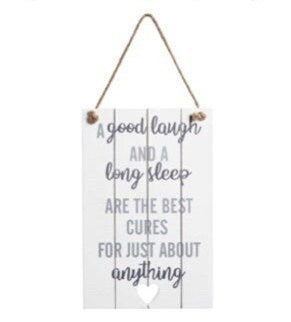 Wooden wall plaque with 'A good laugh and a long sleep are the best cures for just about anything' Text