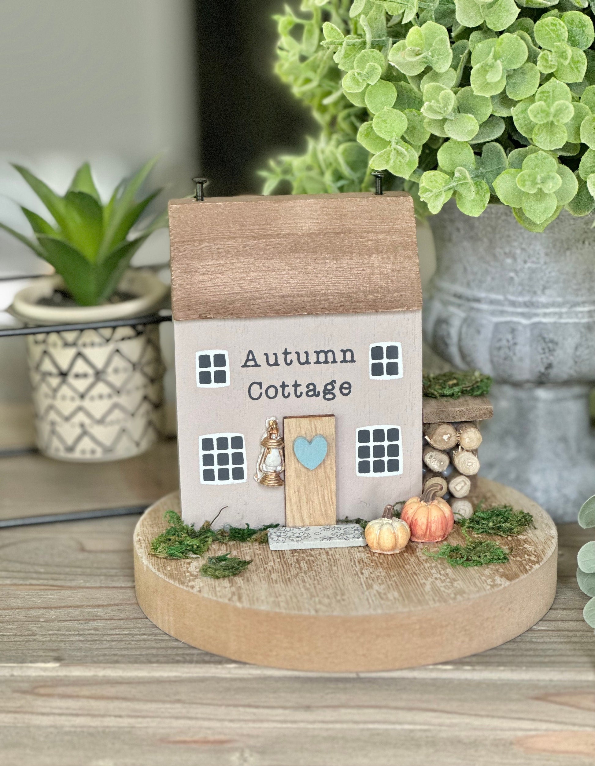 A gorgeous little Autumn Cottage scene set with pumpkins, stacked logs and lantern. Perfect simple charm for creating that cute decorative design that can be displayed throughout your home.