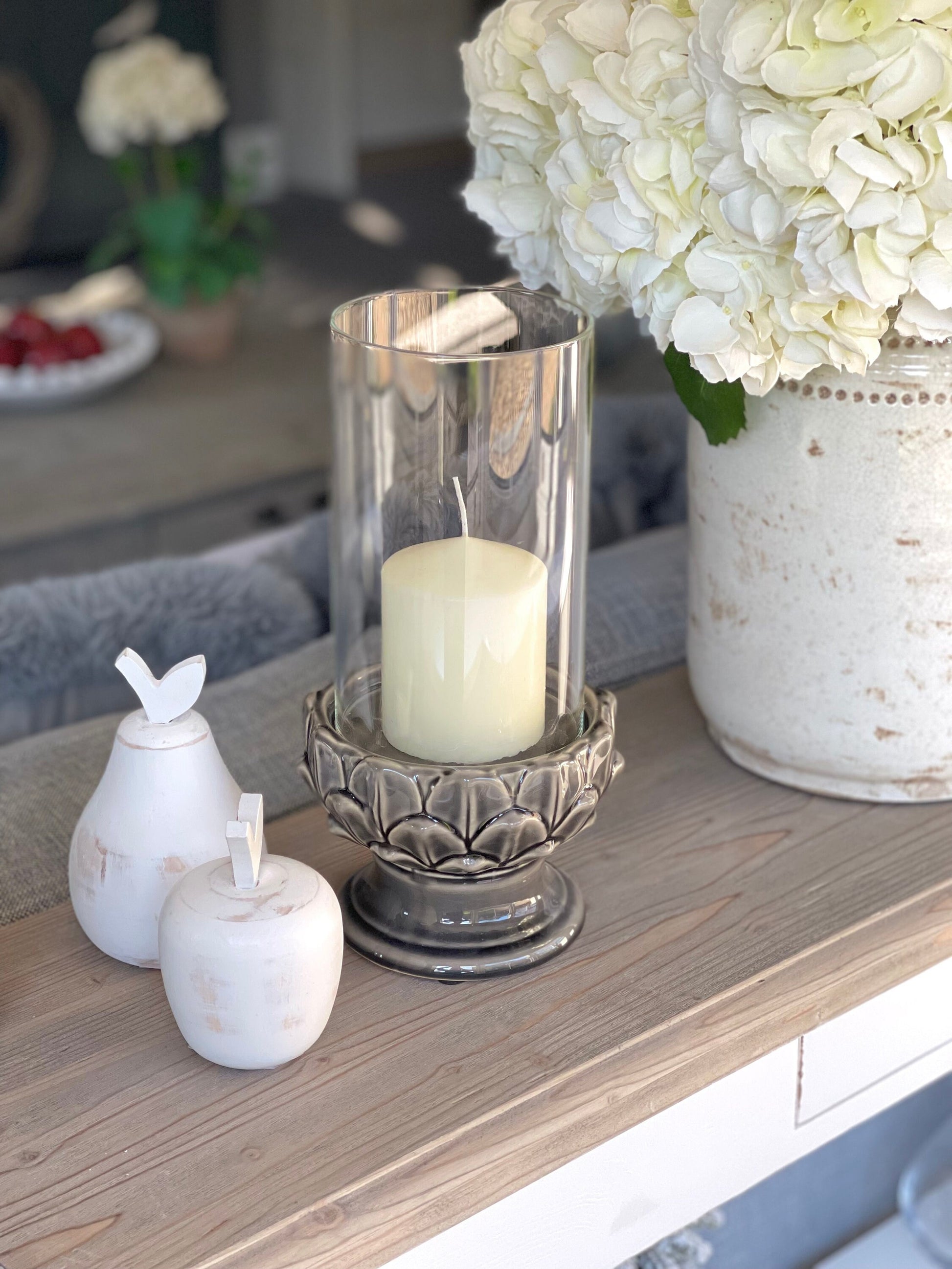 Transform into a Hurricane Lamp by using a pillar candle in the corresponding size. ( Pillar Candle Not Included)