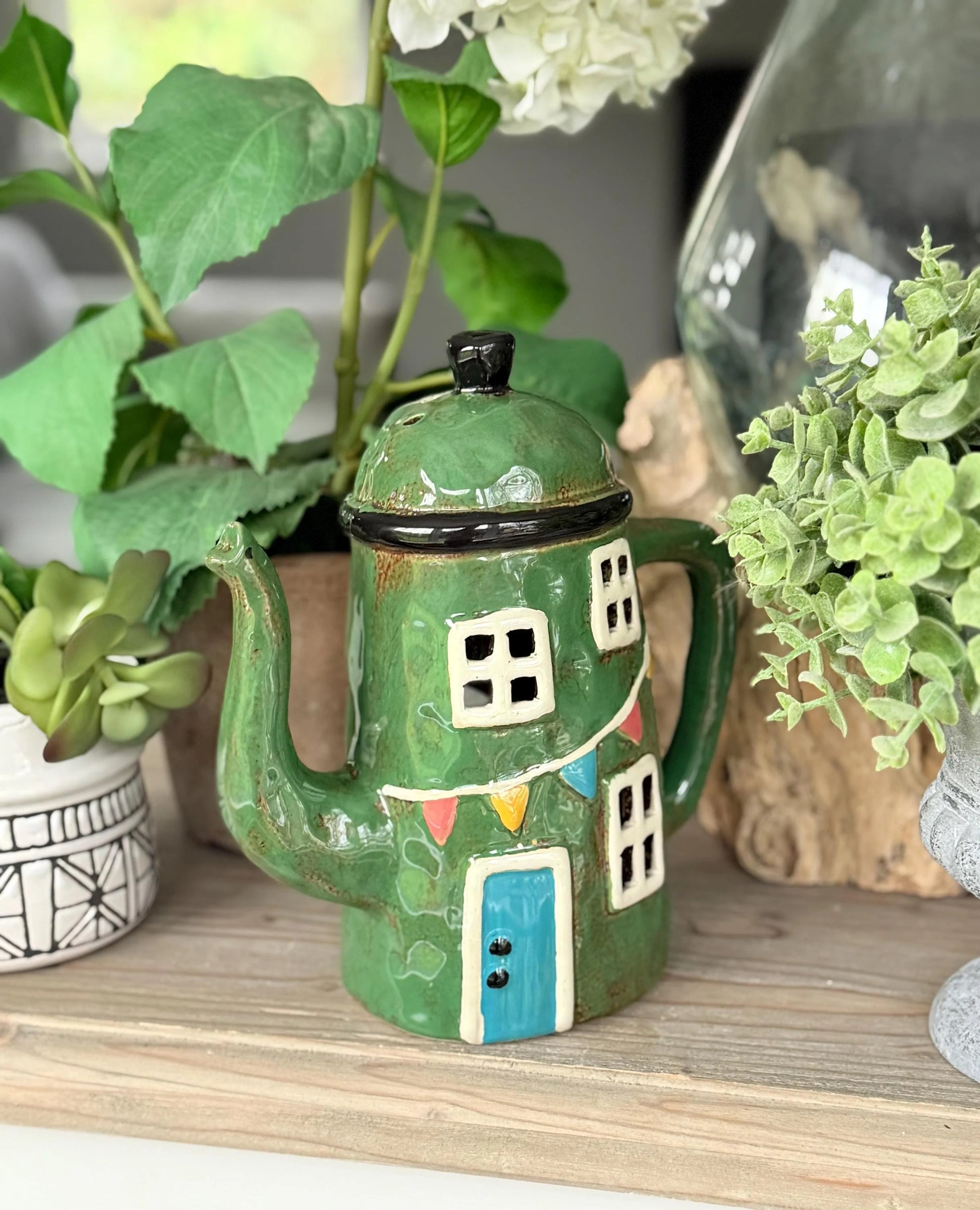 A lovely Teapot ceramic tea light holder featuring a blue front door and multi coloured bunting.