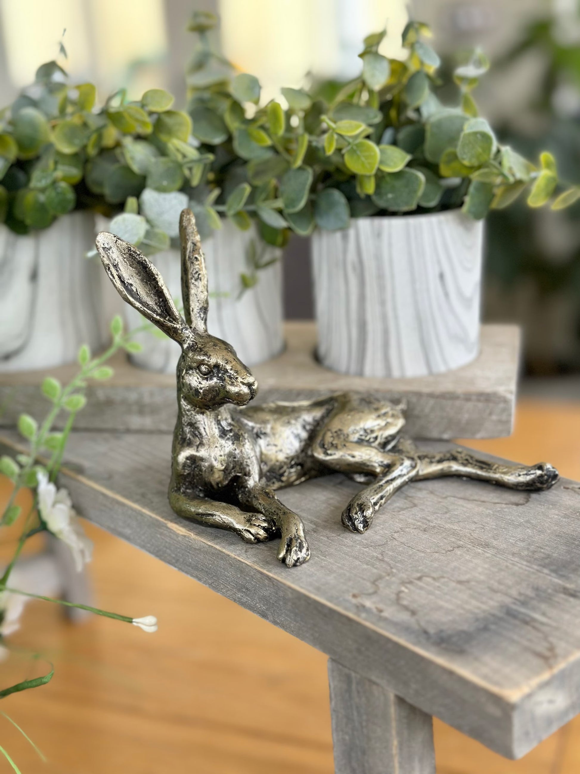 A stylish bronzed lounging Hare ornament with textured detail.
