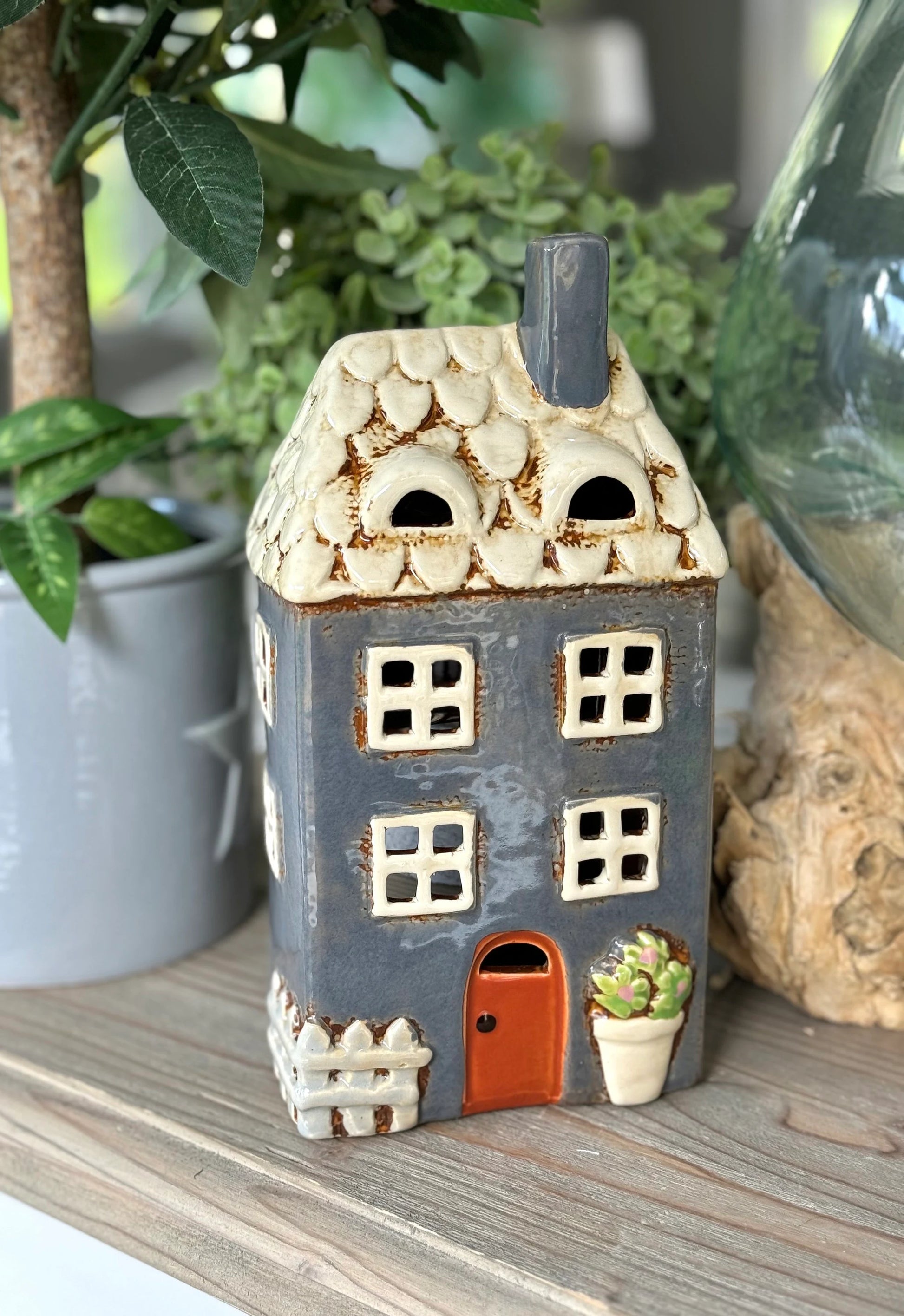 Charming blue and cream glaze, this charming tealight holder features dormer windows, a white picket fence and a floral entrance. It would look lovely when displayed on a shelf or windowsill.