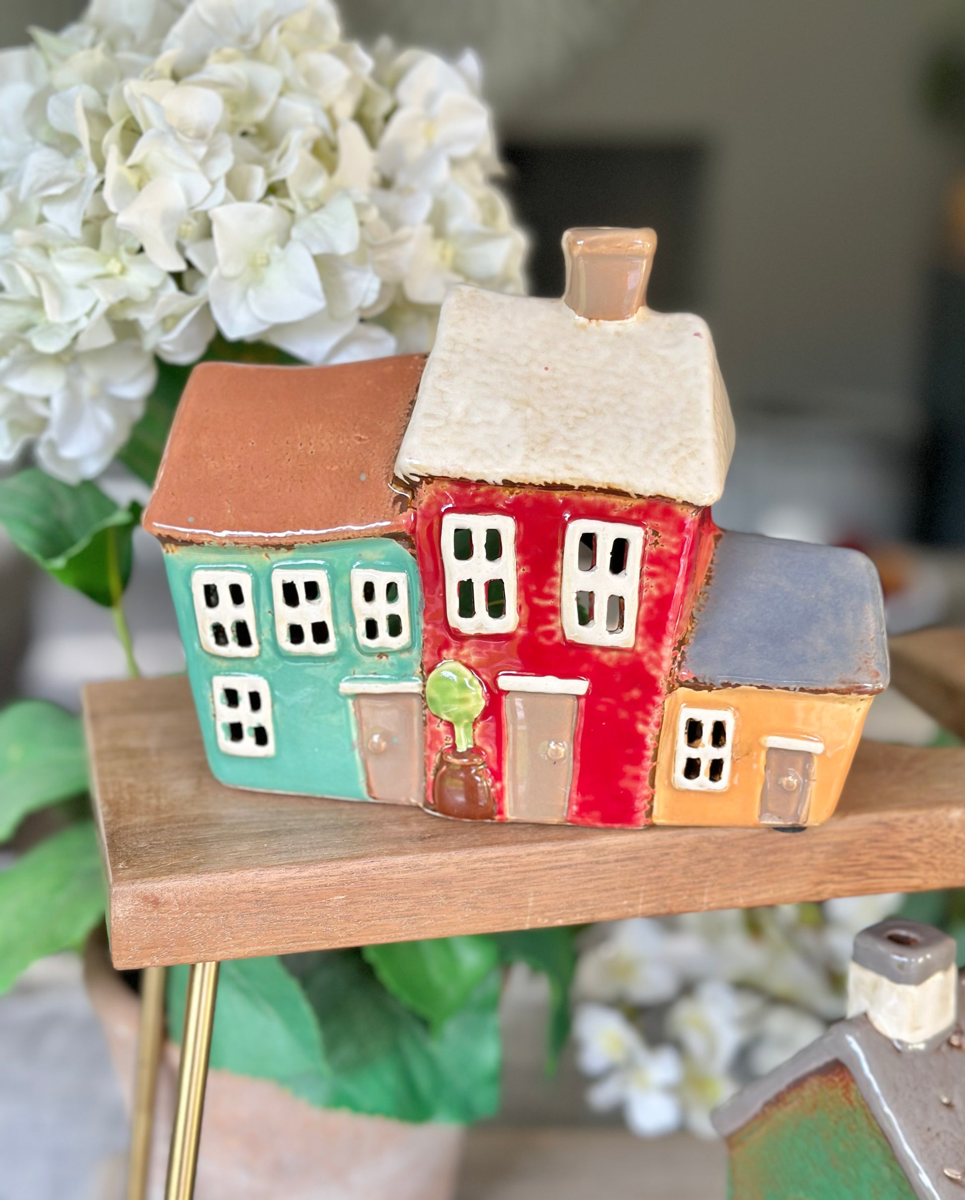 Superbly made ceramic tea light houses. Perfect for dressing your mantlepiece, side table and shelves. Bring a bit of colour, why not theme with all three.