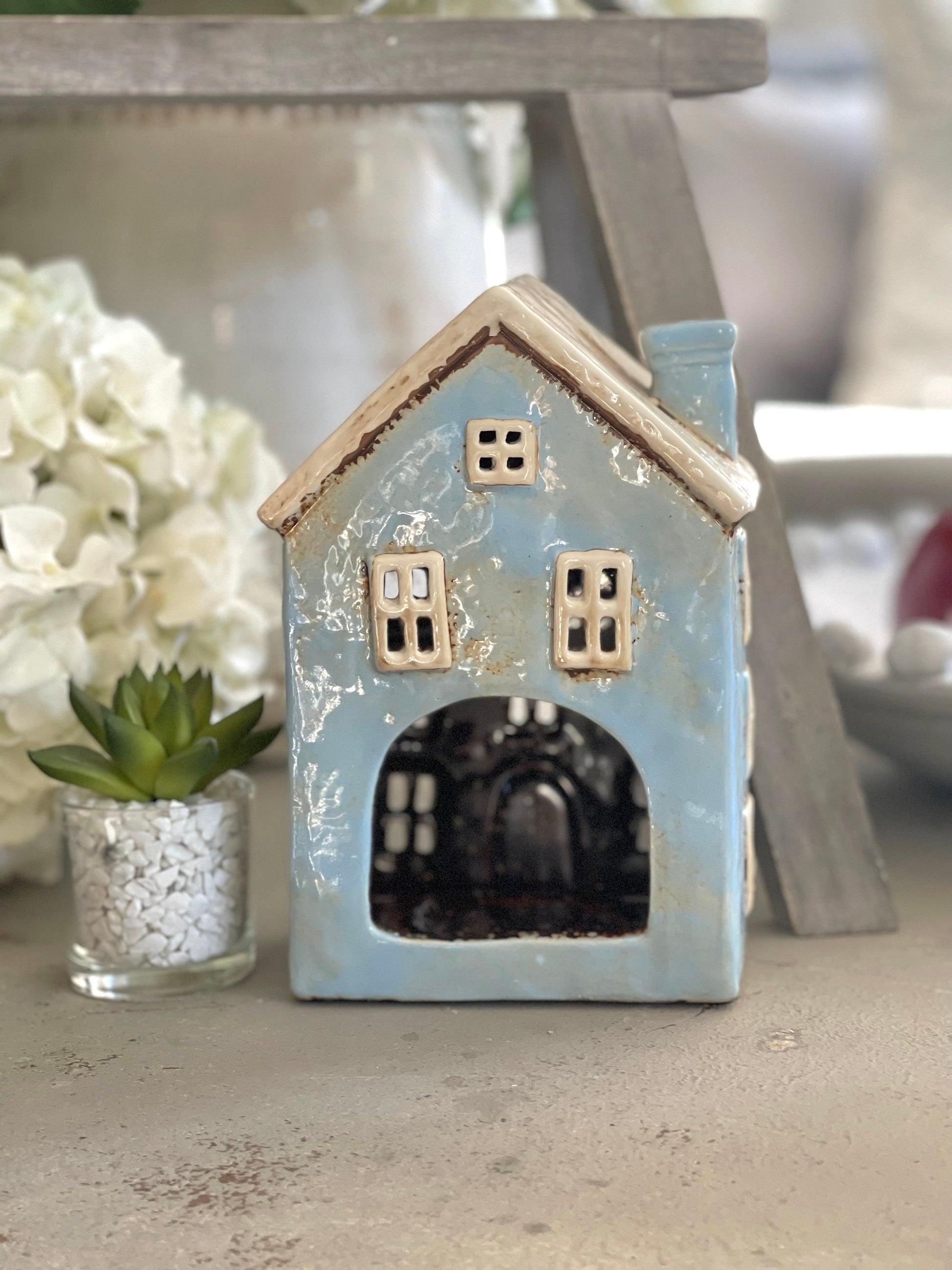 A distressed looking Ceramic House Lantern in a light blue with white details and cut out windows. Ideal for the candle light to shine through a create a warm glow.