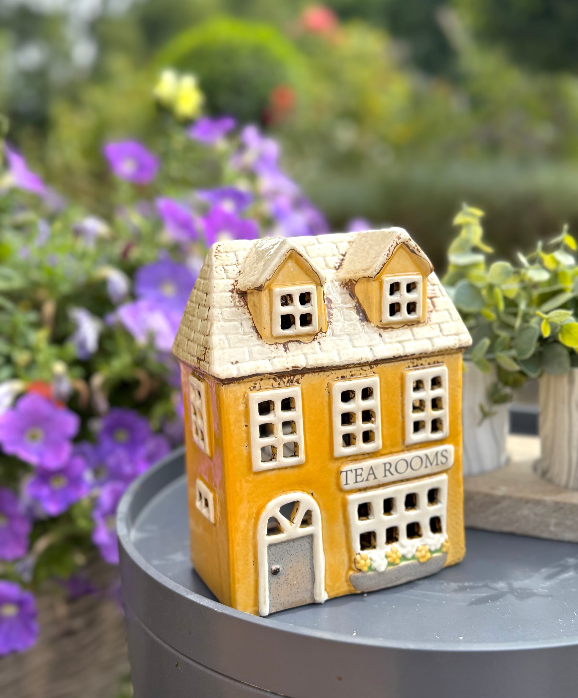 A charming yellow and cream glaze village Tea Room candle/tealight features a tiled roof with open chimney, dorma windows with sign 'Tea Room'. It would look lovely when displayed on a shelf or windowsill.