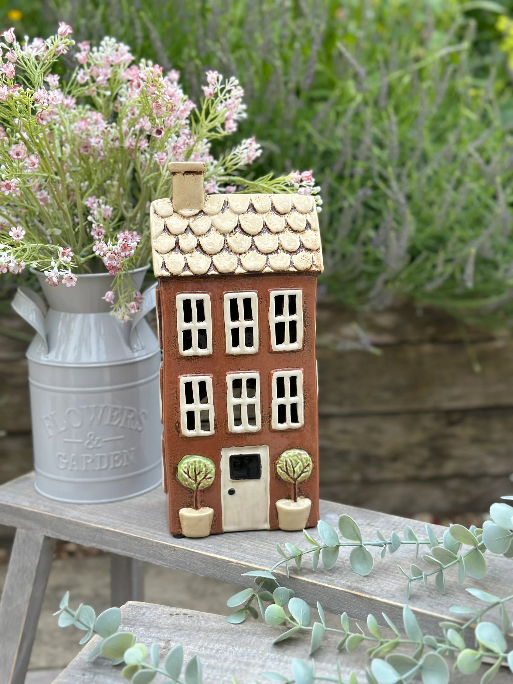 Brown with cream roof, windows and front door with beautiful bay trees dressing the front entrance