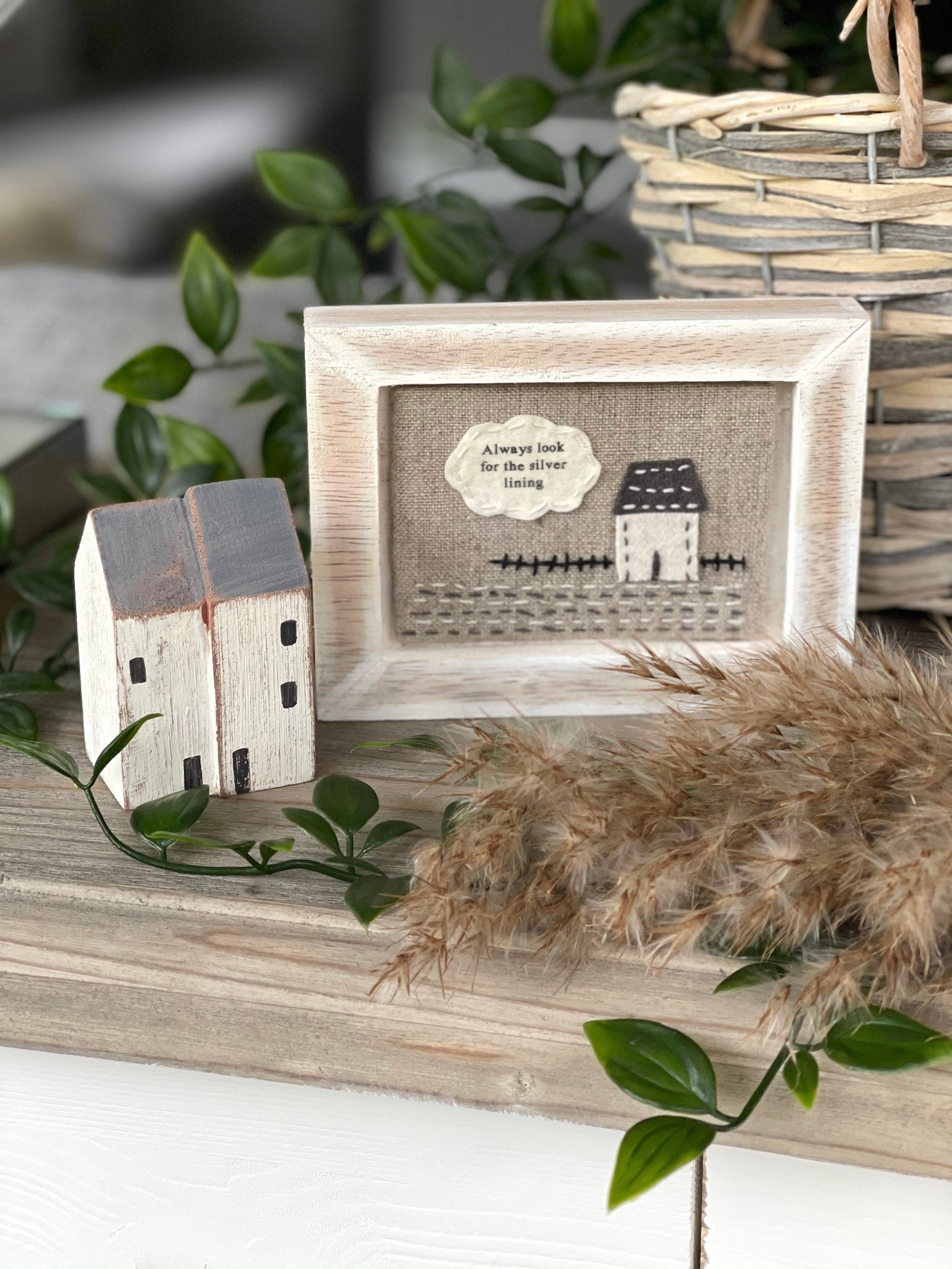 The scene shows a quaint fenced cottage overlooking a field, with a fluffy white cloud in the sky. Inside the cloud are the words ‘Always look for a silver lining’, written in a vintage typewriter style font.