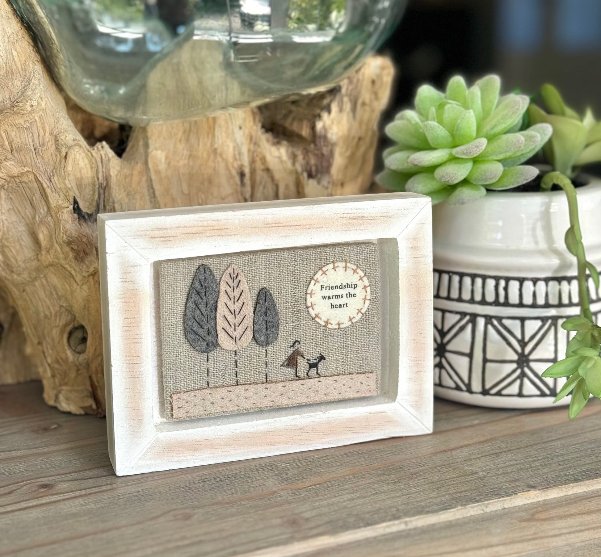 The scene features a woodland with a lady walking her dog ‘Friendship warms the heart’, embroidered in the sun above in a vintage typewriter style font.
