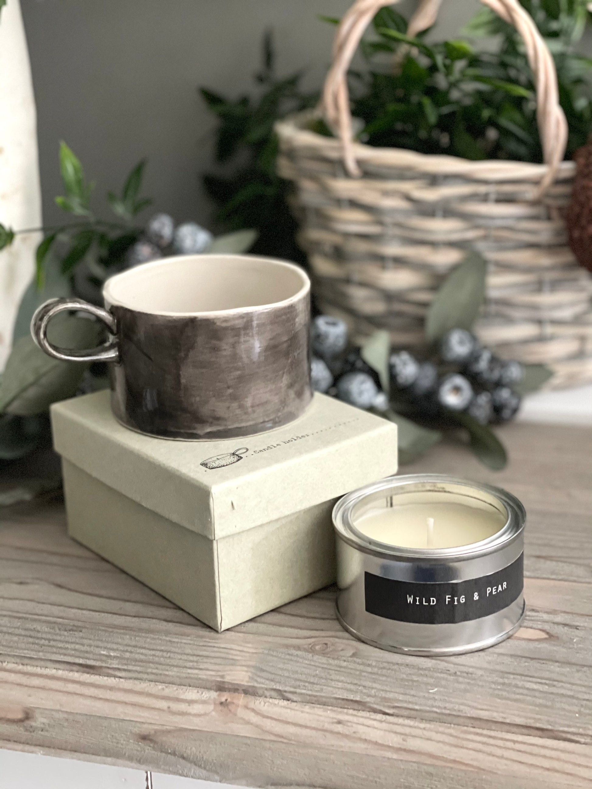 Handled Candle Holder-Black Wash. Comes with a scented candle tin "Wild Fig and Pear" so you are all set to light and go.