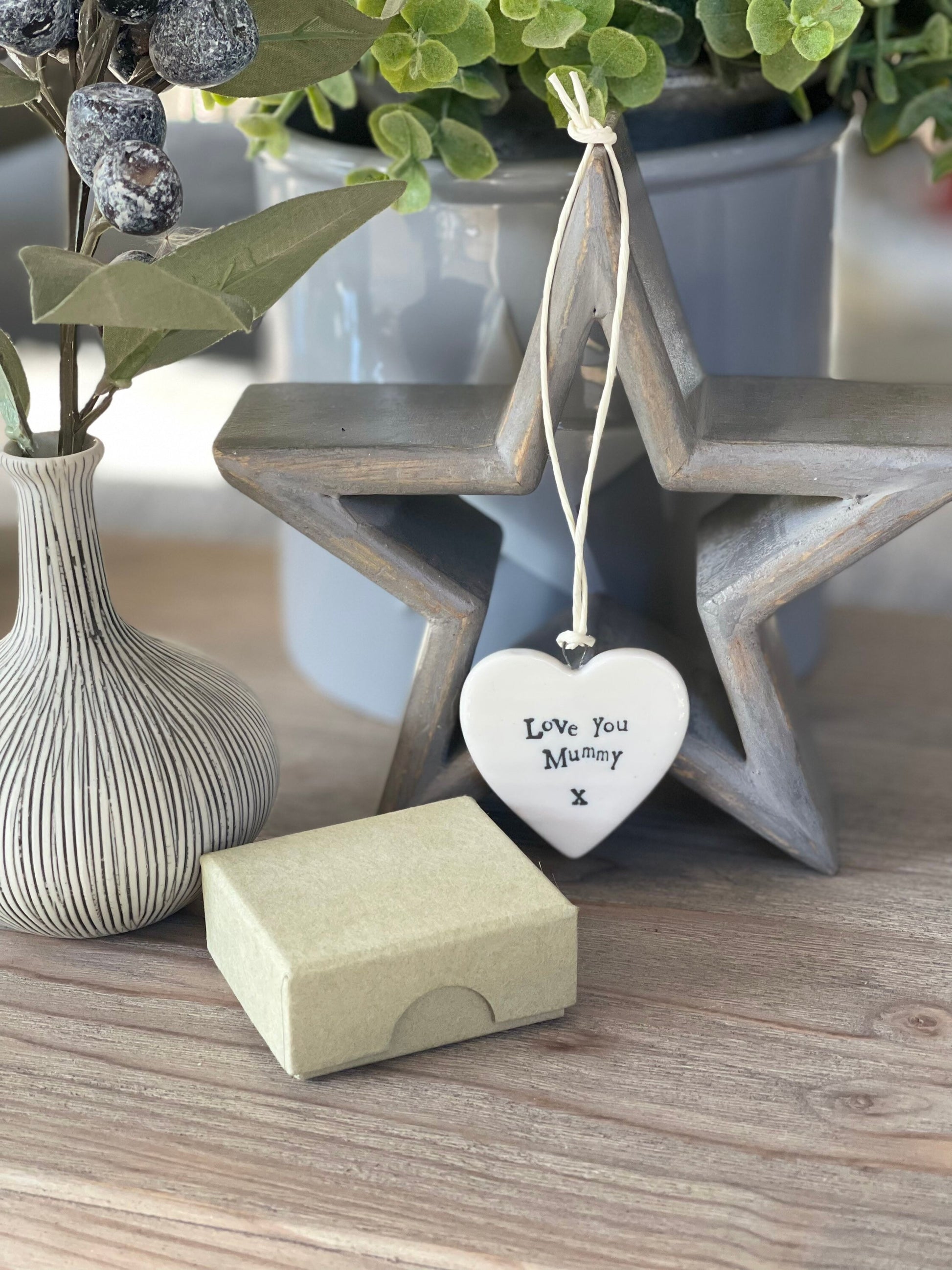 This beautiful little hanging porcelain heart makes a delightful little gift for a very special Mum.