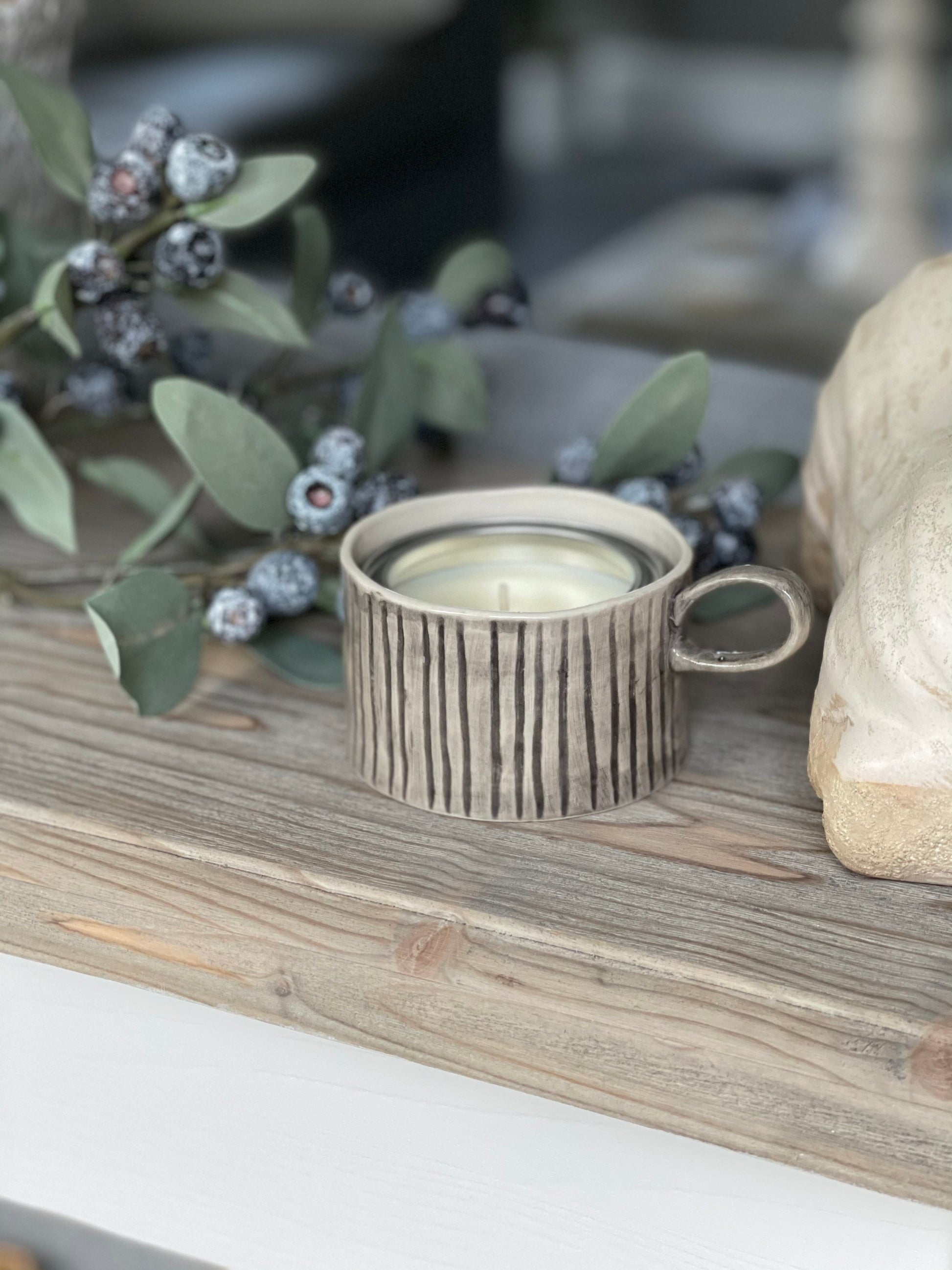 Vertical scratched lines. Comes with a scented candle tin "Gooseberry and Elderflower" so you are all set to light and go.