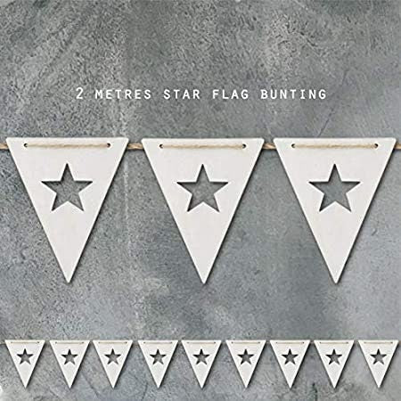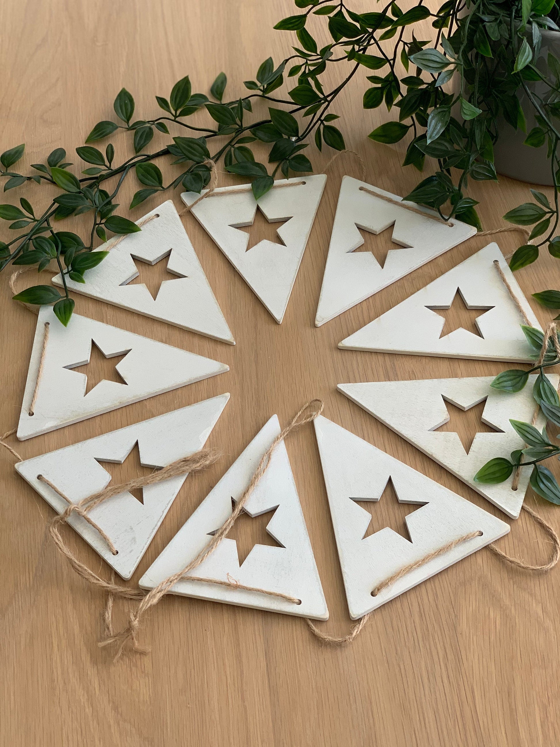 East of India, gorgeous hanging flag wooden bunting, features 9 individual white flags hanging from a hessian rope with loops either end