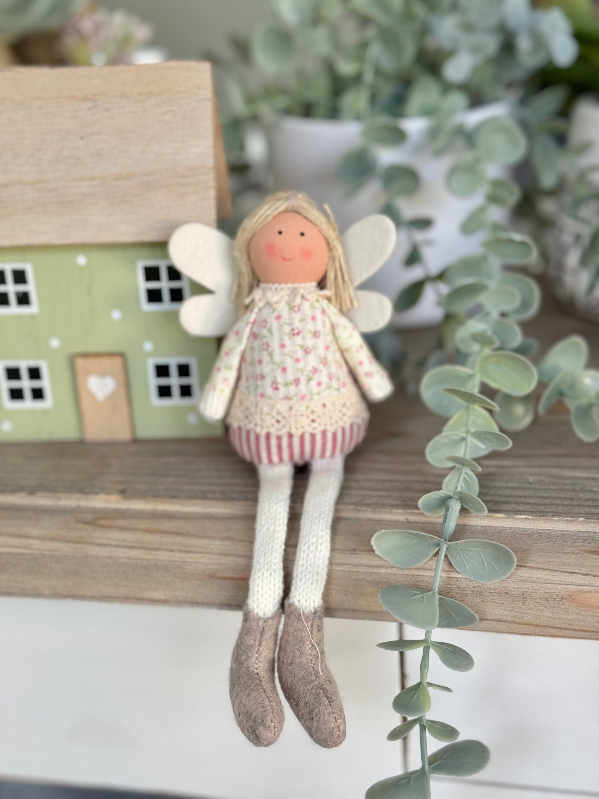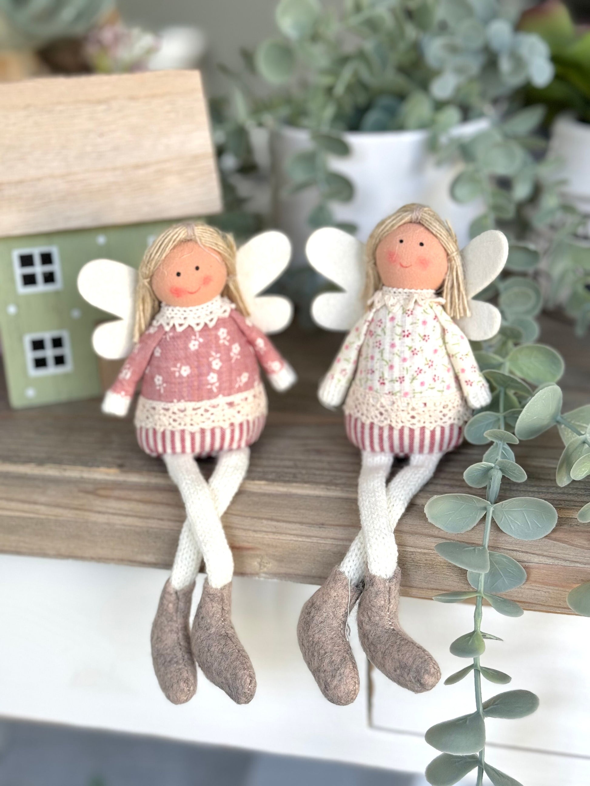 They are so sweet and look absolutely perfect in any room. They sit and dangle their feet over a shelf, mantle, or bookcase, the list is endless! All have cute white wings and are finished with beige woolly booties.