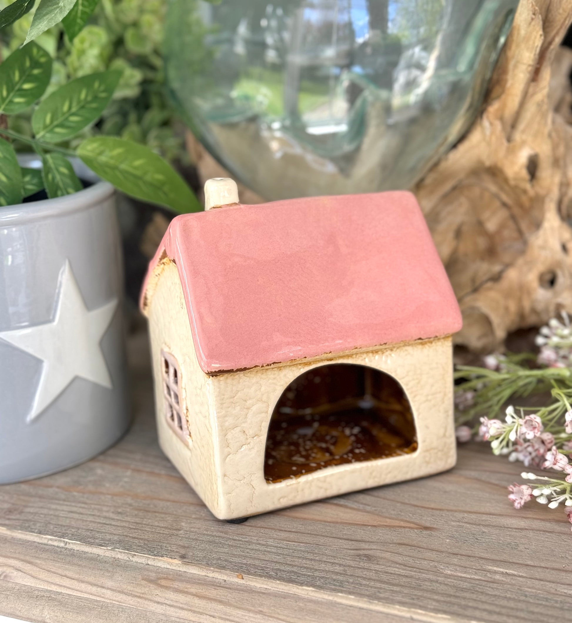 A charming pink and cream glazed house, this charming candle/tealight features a pink roof with an open chimney, window plants and a sweet bunting. It would look lovely when displayed on a shelf or windowsill.