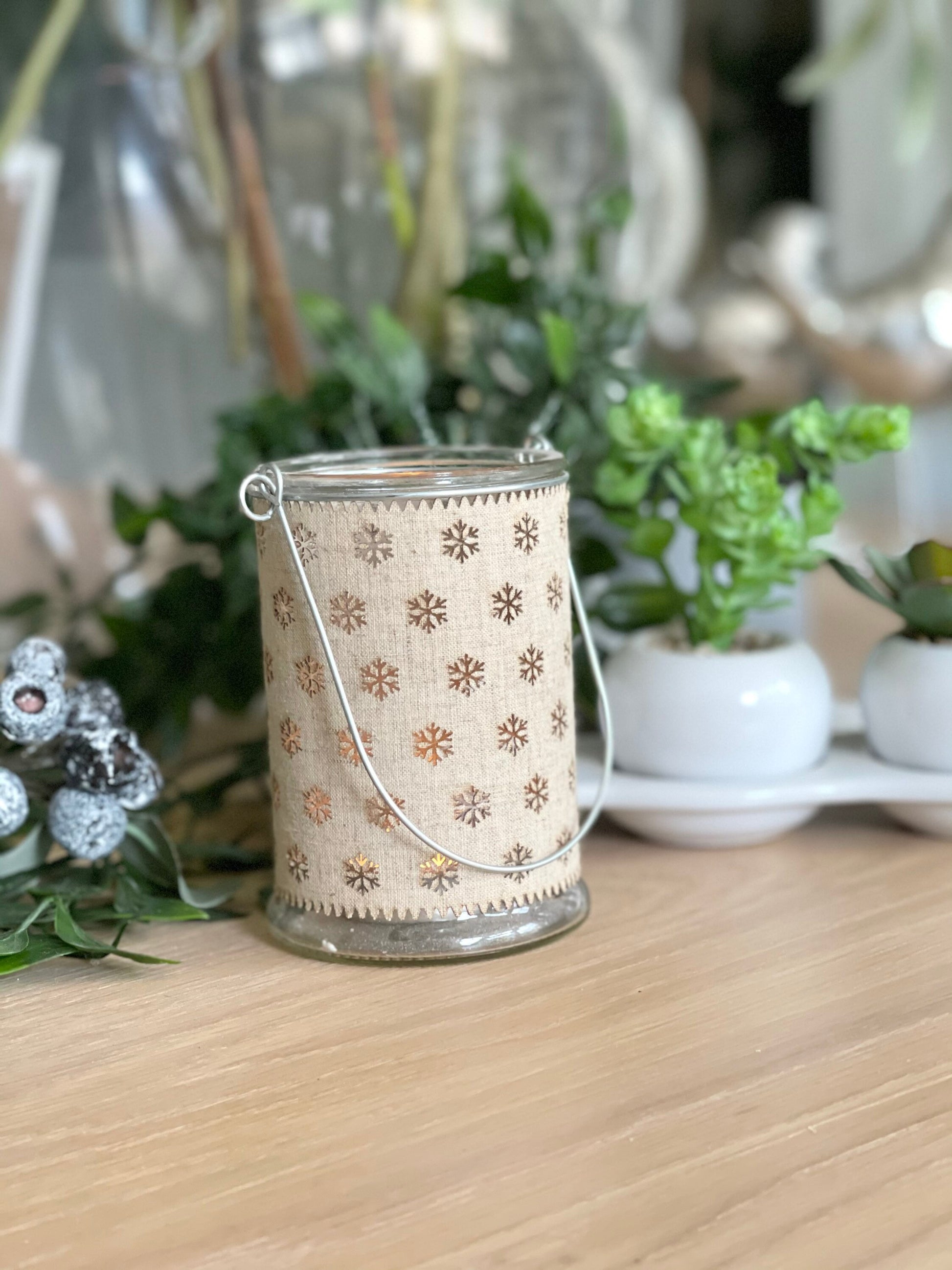 A charming glass lantern with a snowflake design wrap. A rustic style festive decoration for the home.