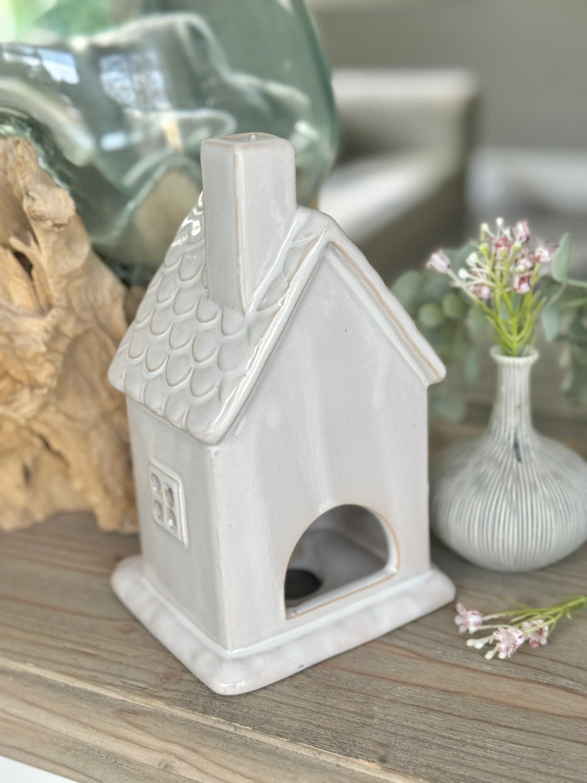 White ceramic house decoration with cutout windows and front porch which allows the beautiful warm glow of your tea light.