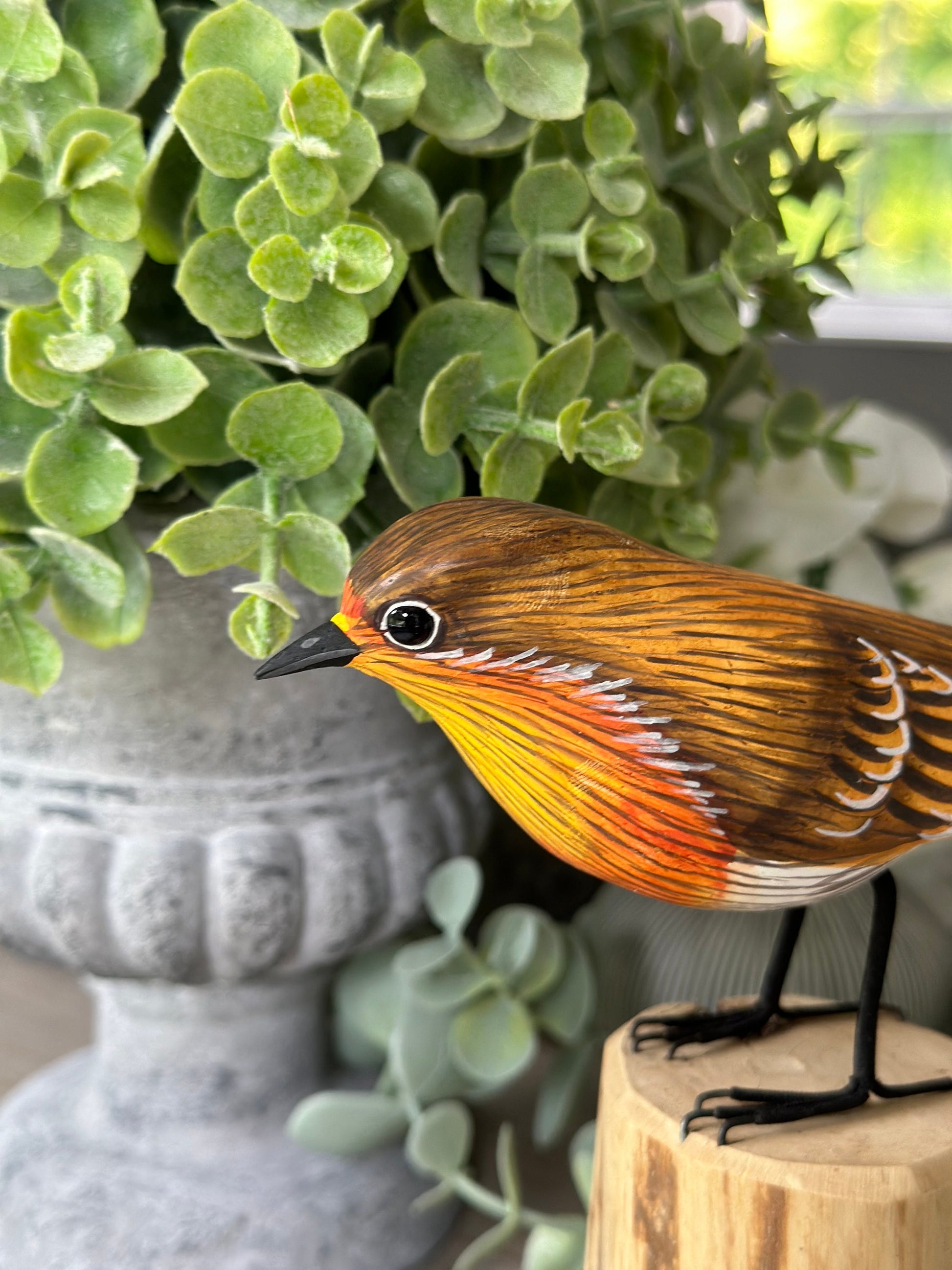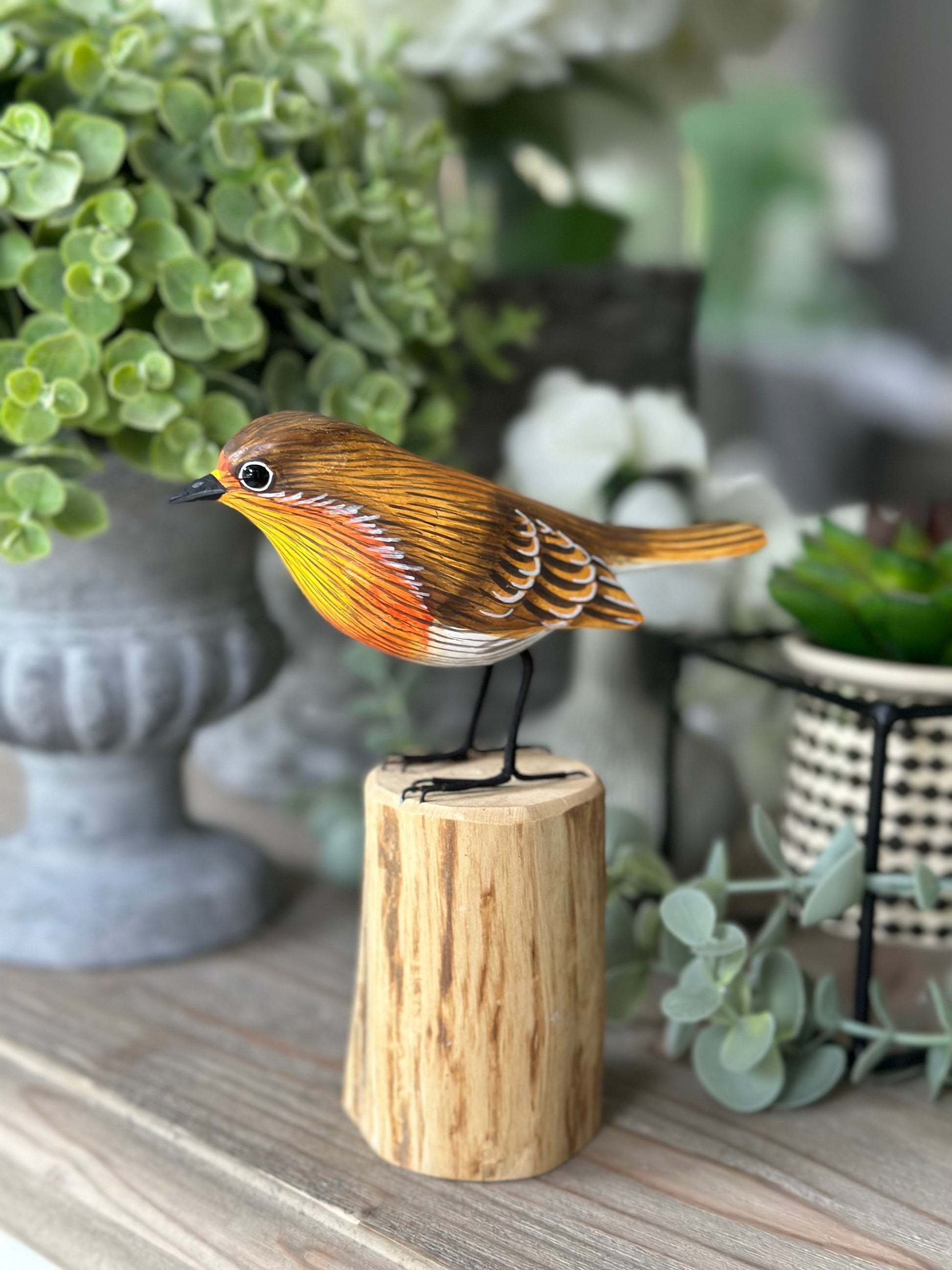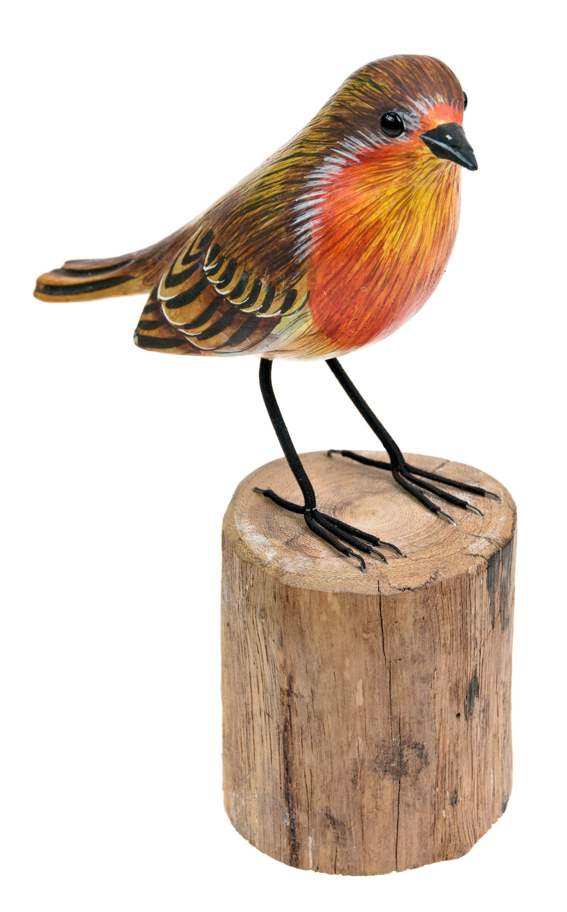 This Wooden Orange Breast Robin sat on a tree stump will light up any room and is full of wonderful personality! Cheeky little fella!