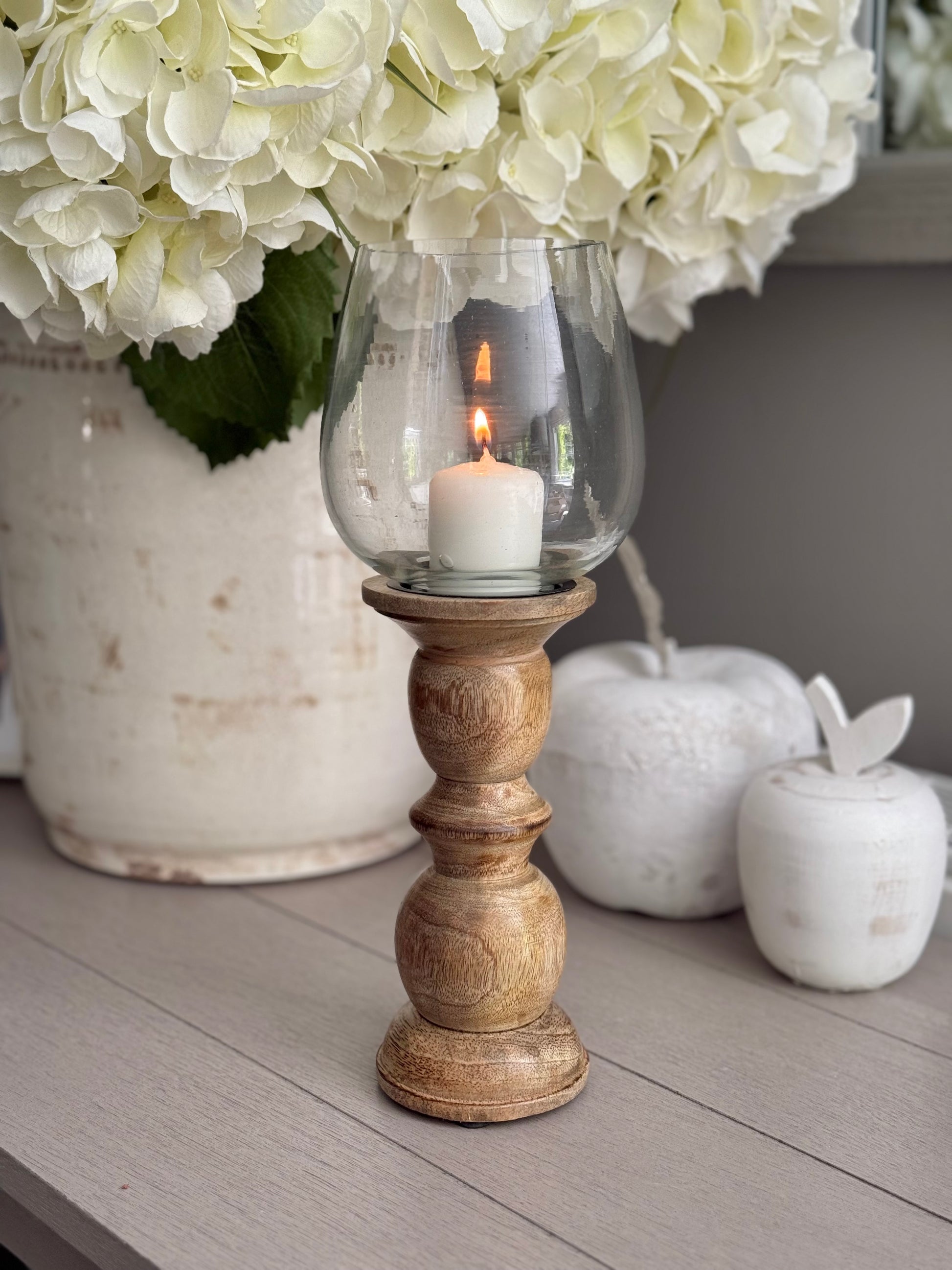 Wooden Candlestick/Lantern with Candle. It would look lovely on a console table or to accessorise the fireplace or outdoor dining. Comes with a Candle as shown in the picture.