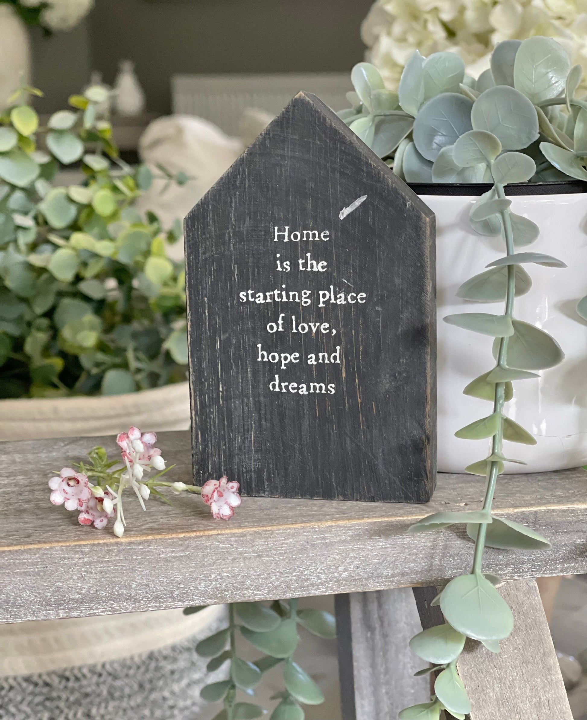 Wooden Black House which reads - Home is the starting place of love, hope no dreams