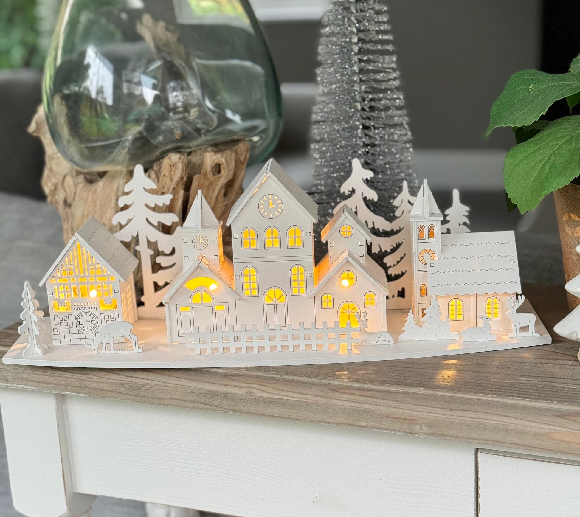 This is a lovely white wooden village scene. Part of the popular village scenes this season and complements the village scenes we also sell with the rotating train. A snowy village scene with a central house, a chapel on one side with further cottages surrounding.