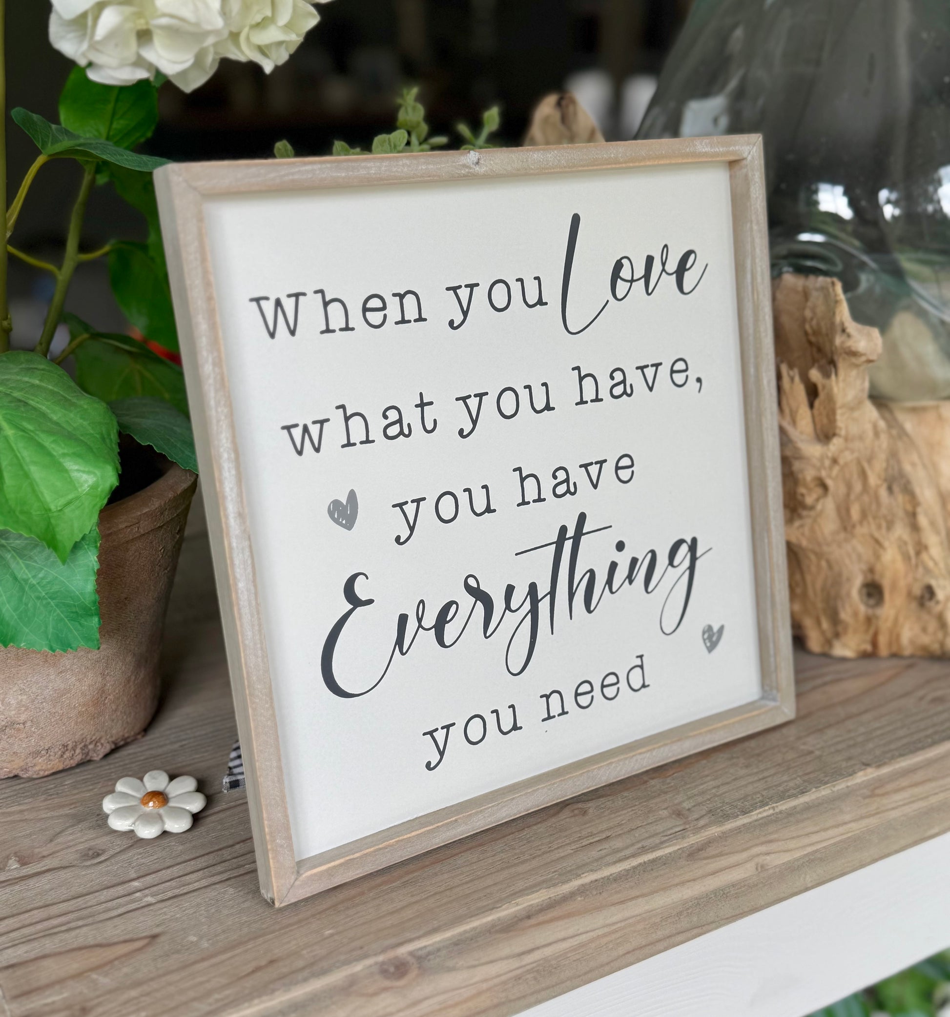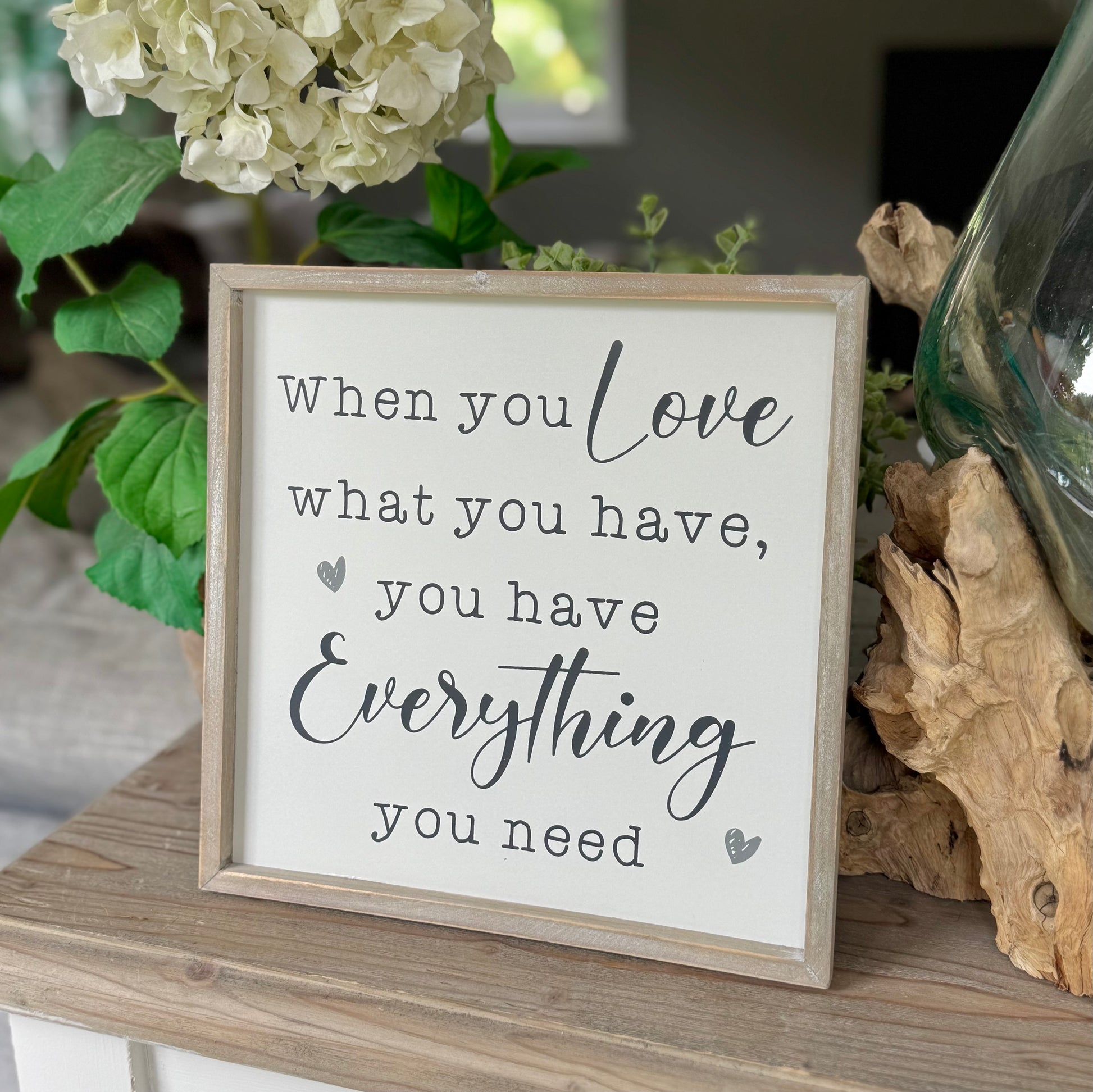 A beautifully wooden sign, inscribed with the quote “When you love what you have, you have everything you need,” is a timeless reminder to embrace gratitude and simple joys.