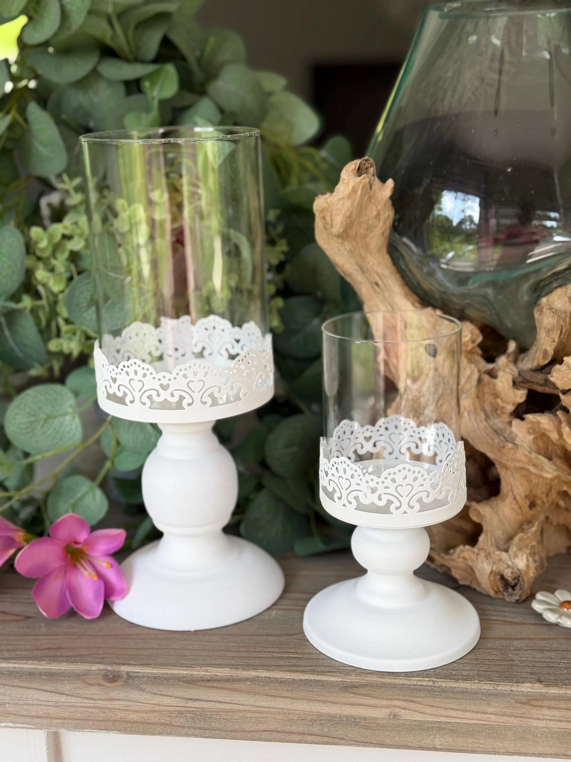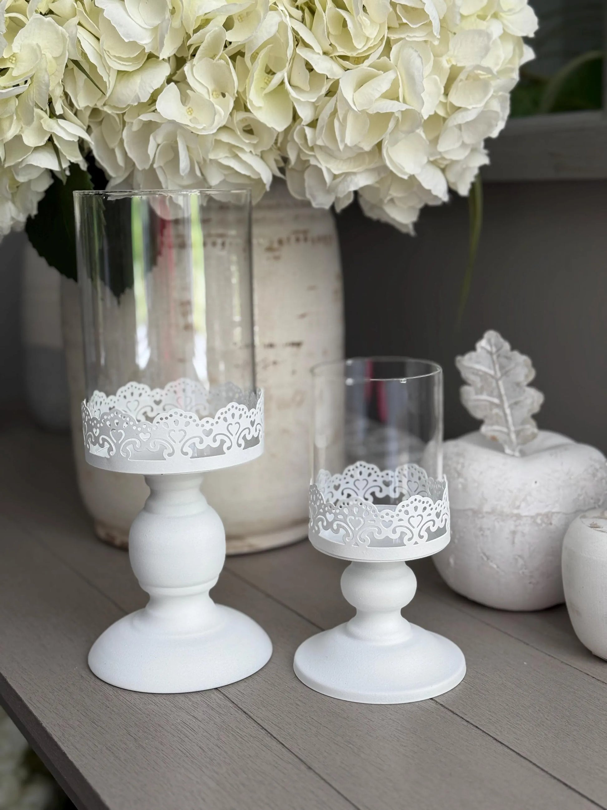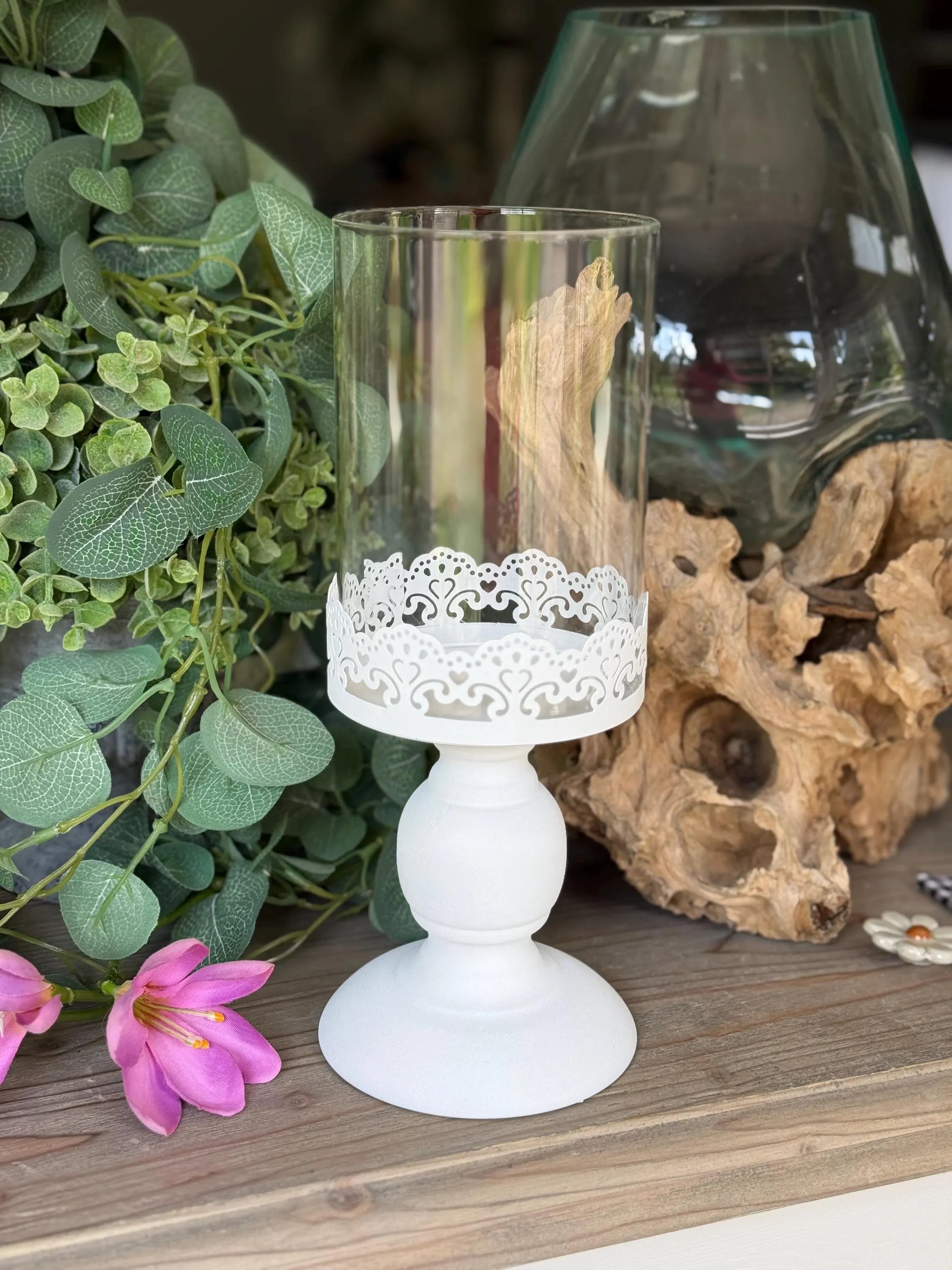 Hand painted White Metal Candlestick/Lantern/Hurricane