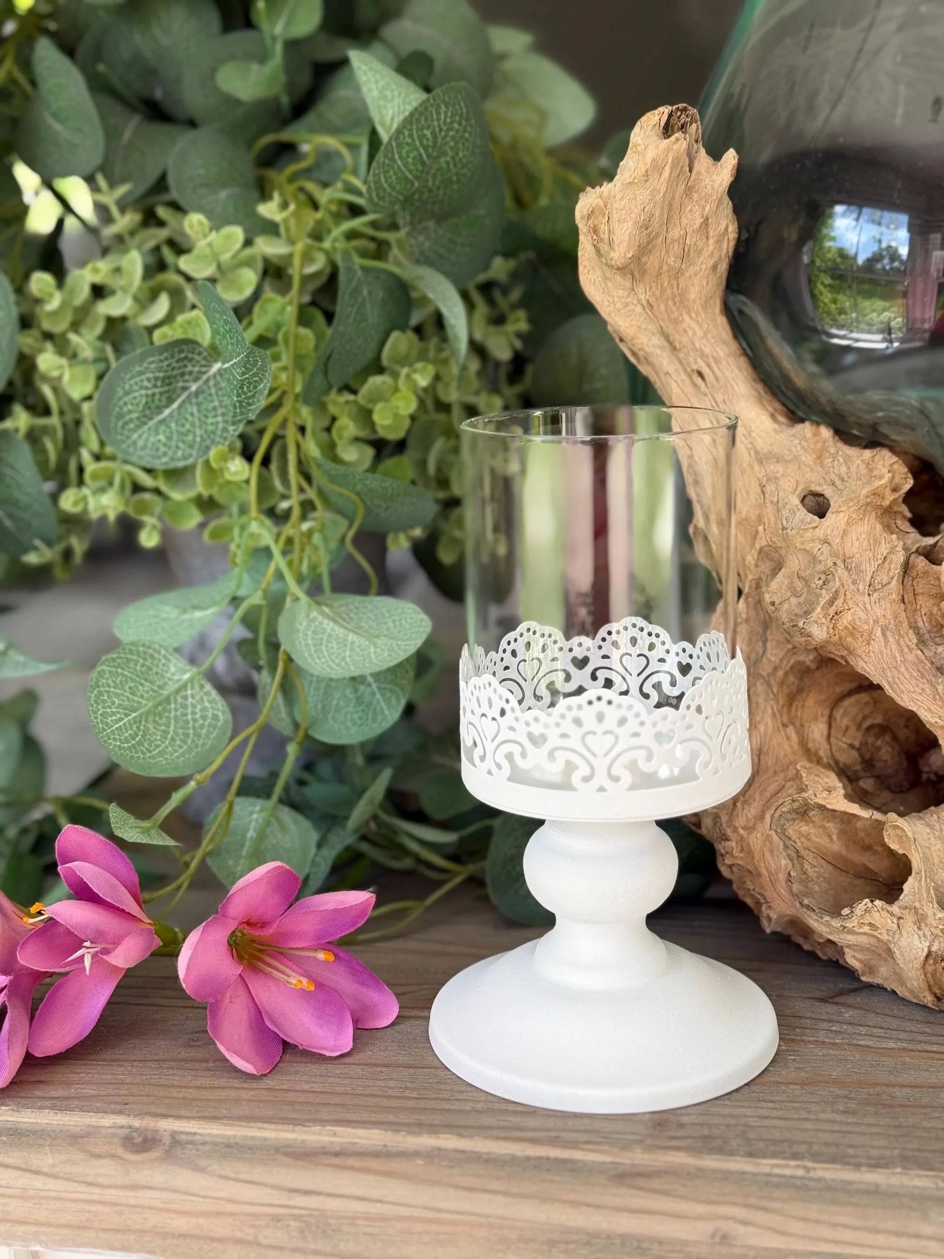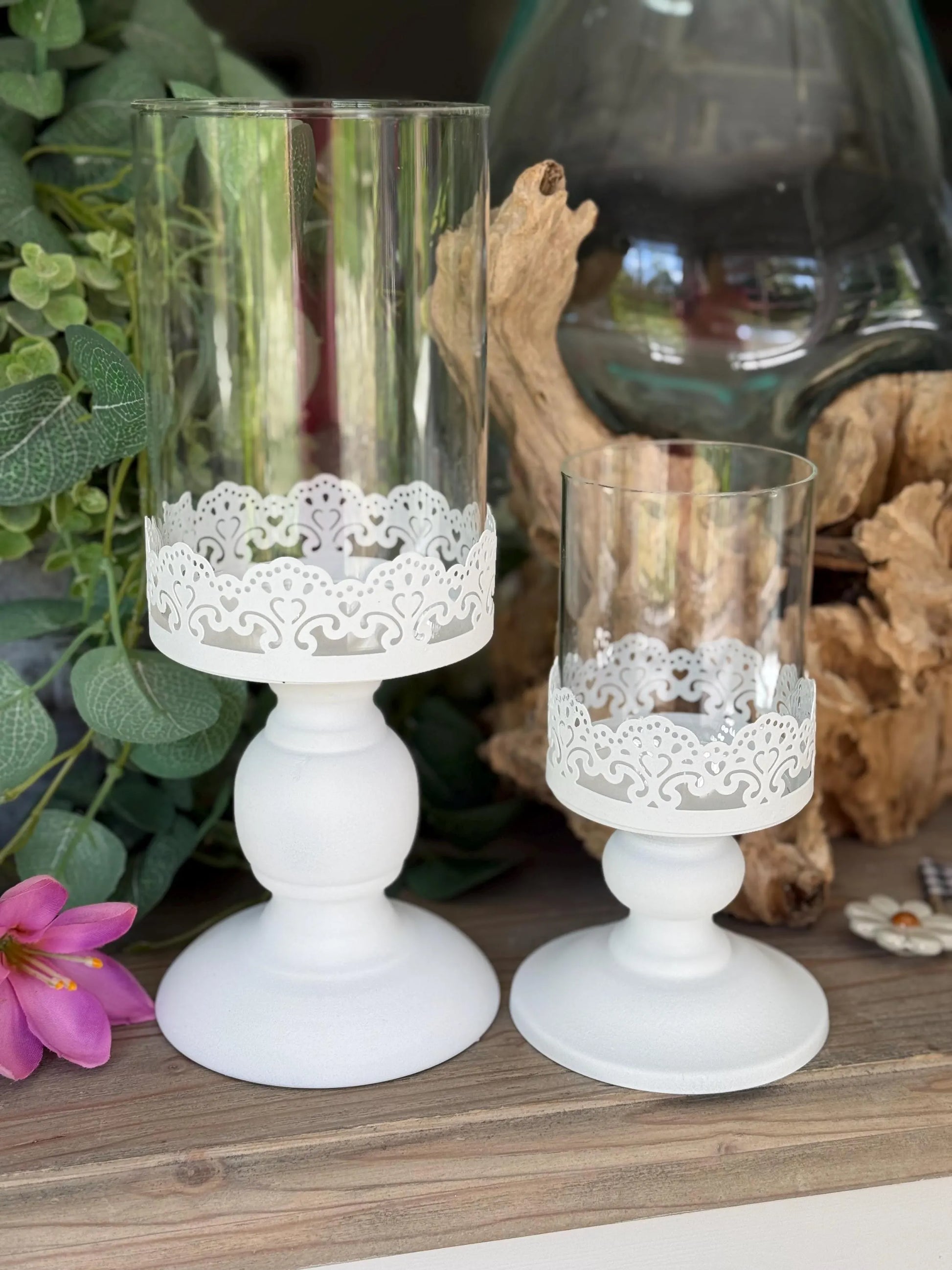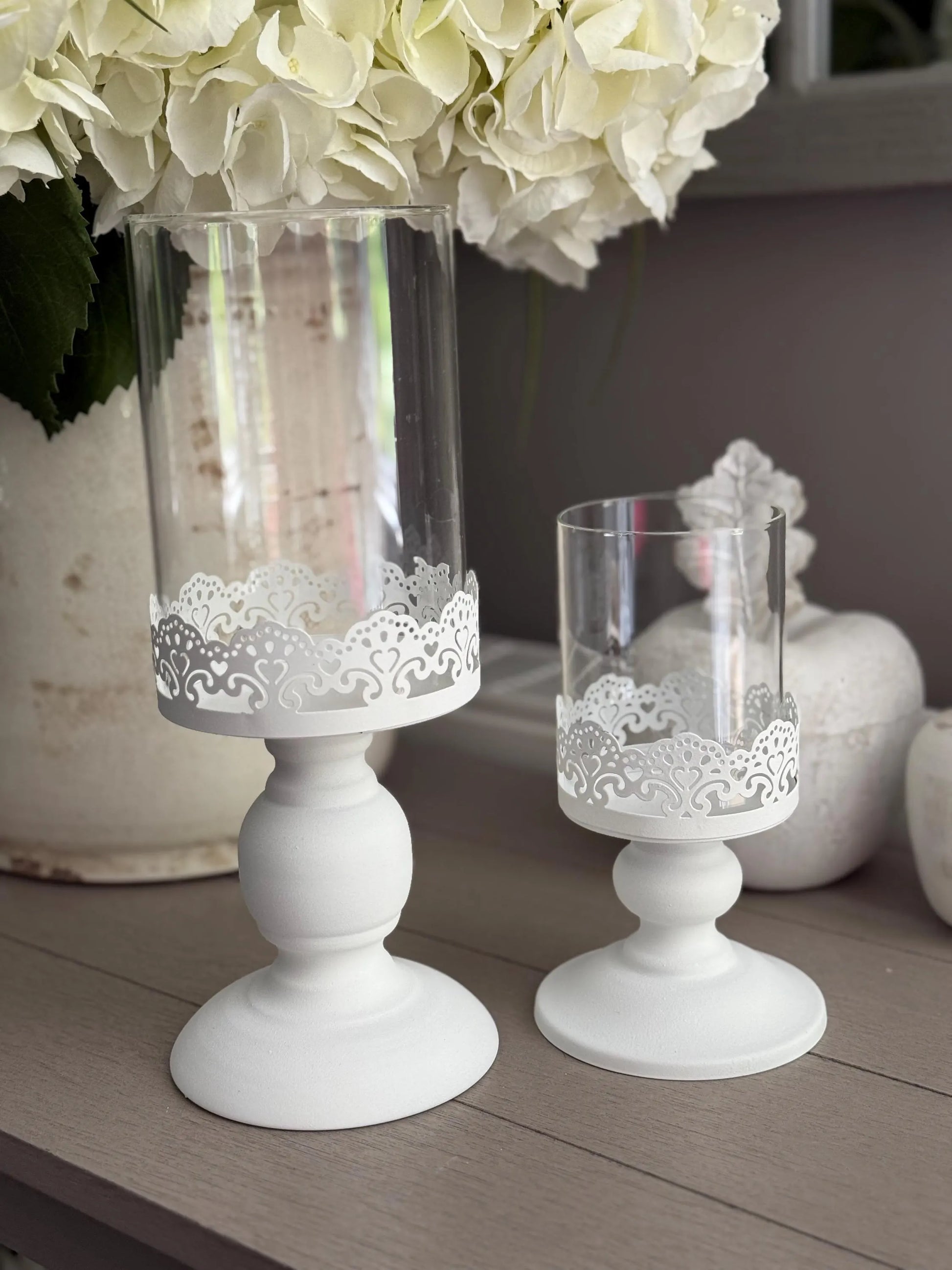 Hand painted White Metal Candlestick/Lantern/Hurricane