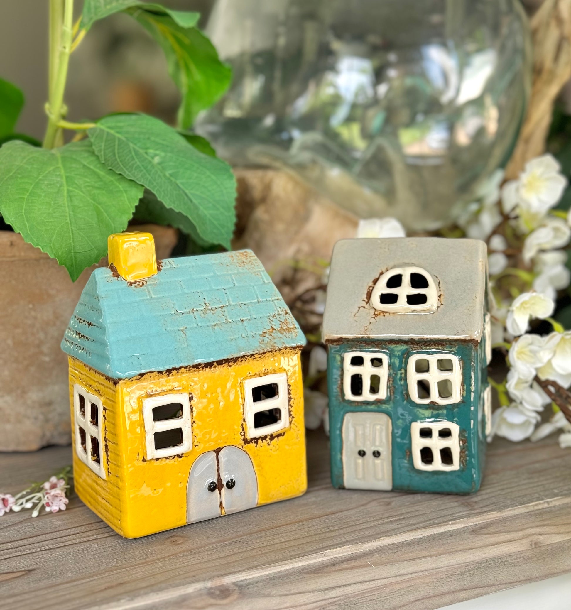 This charming tealight holder, with a small yellow glaze, features an aqua roof, cream windows, and a grey double door.