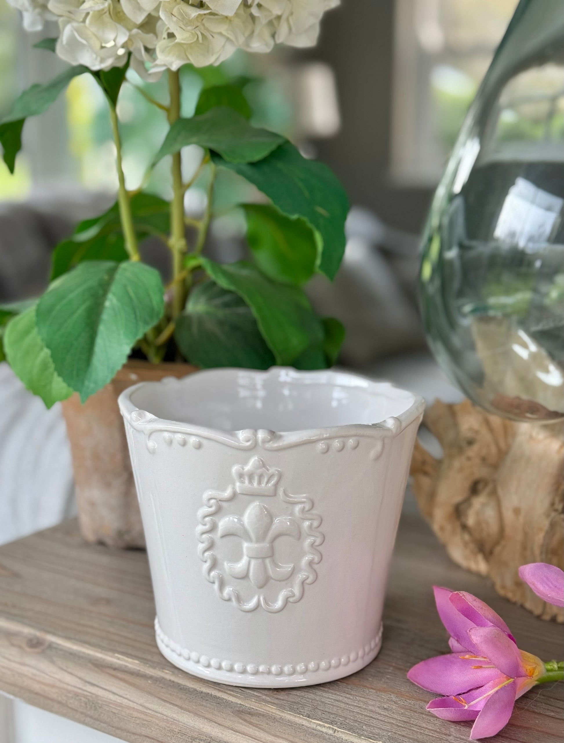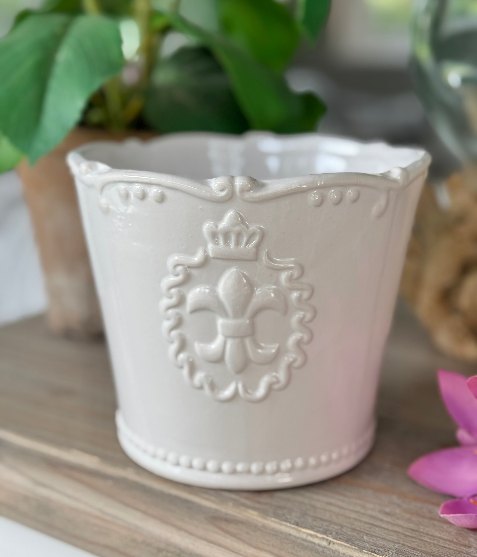 A sleek and simple dolomite pot set with a grey base tone and charming Fleur De Lis embossed finish. Plant not included