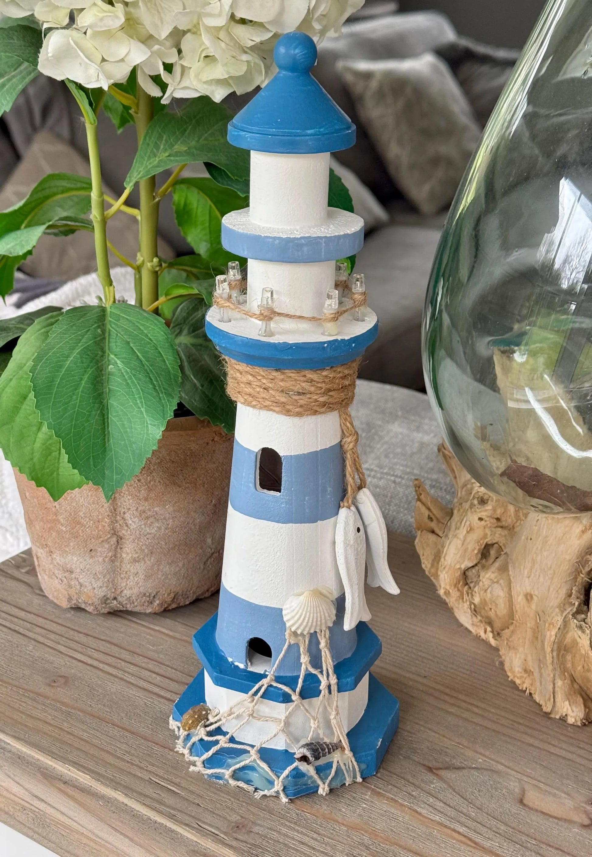 Made of wood and natural colours of white and blue, featuring seashells and fisherman netting for that complete nautical look.
