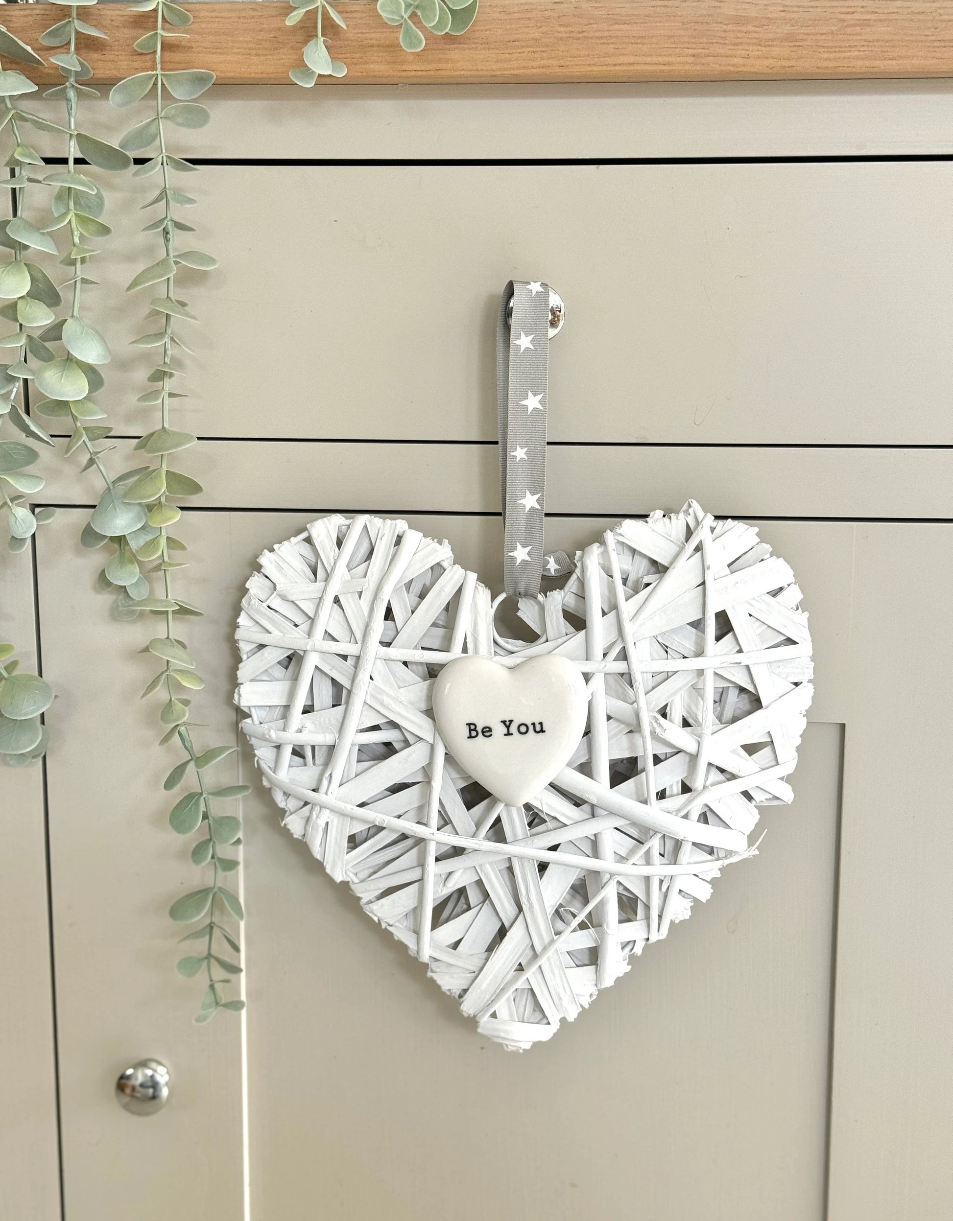A traditional hand painted wicker heart decoration with a white ceramic tile 'Be You" attached and finished with a grey and white star ribbon for hanging.