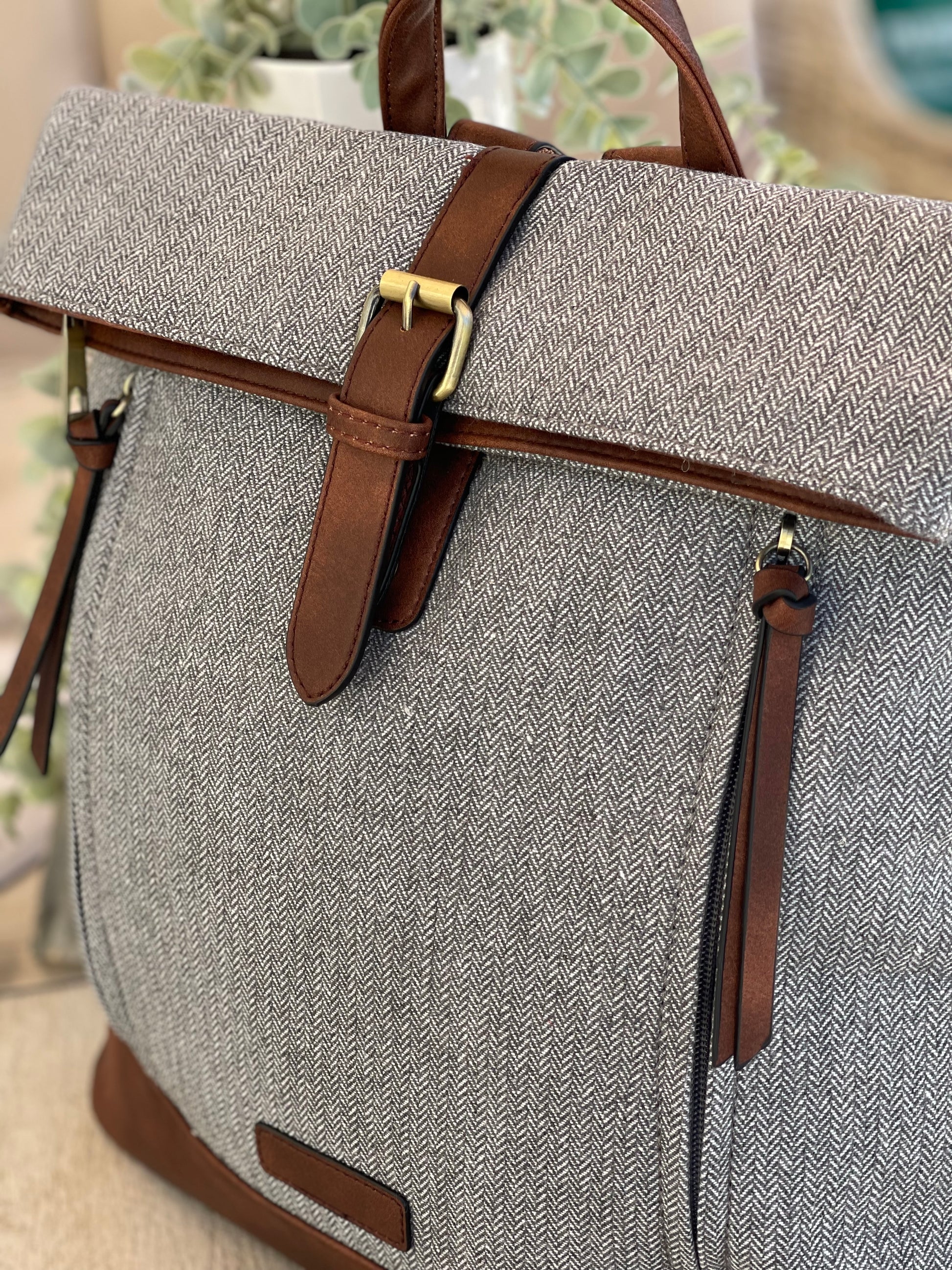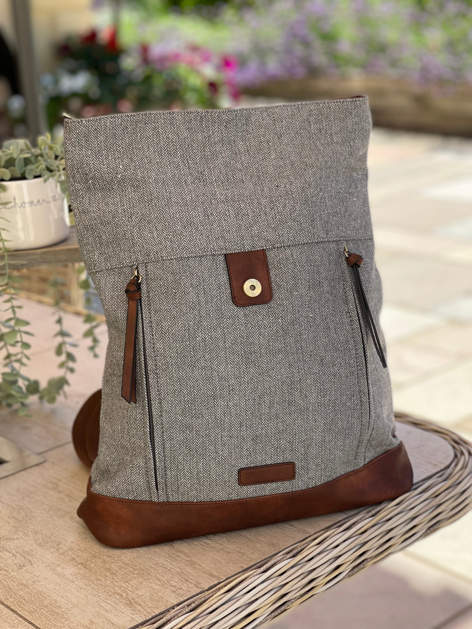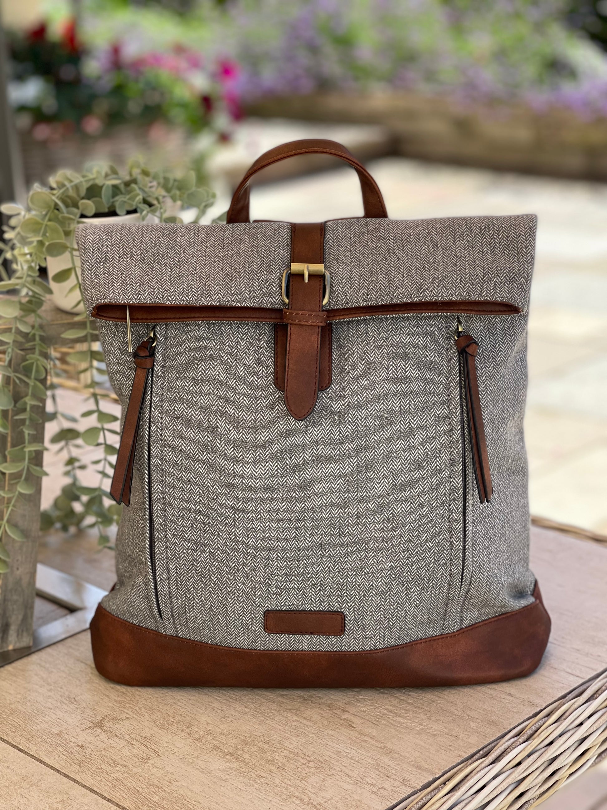 A lovely new herringbone canvas rucksack design for everyday use and city adventures. Handmade minimal and versatile, this rucksack is designed to have an adjustable size depending on your needs.