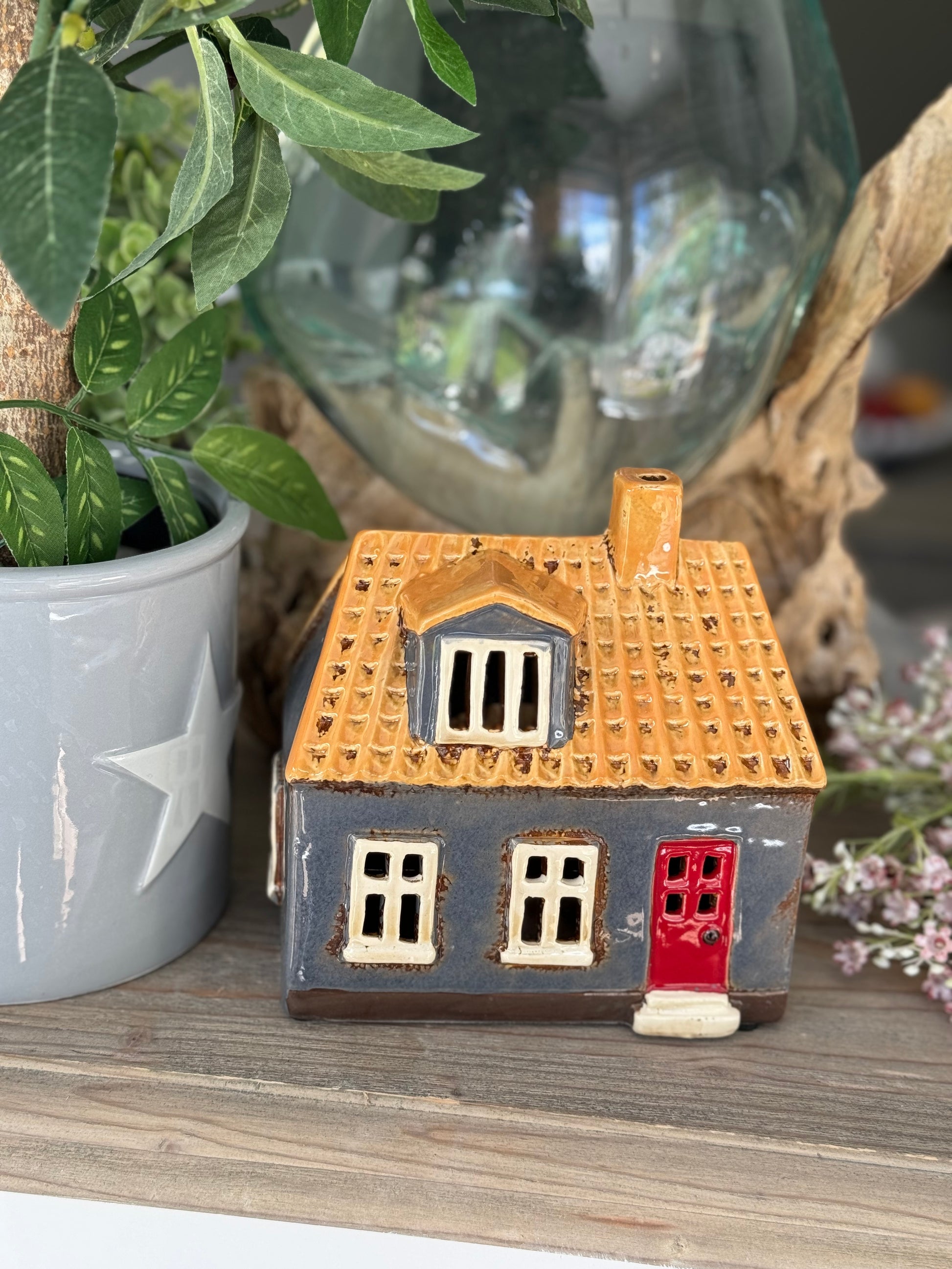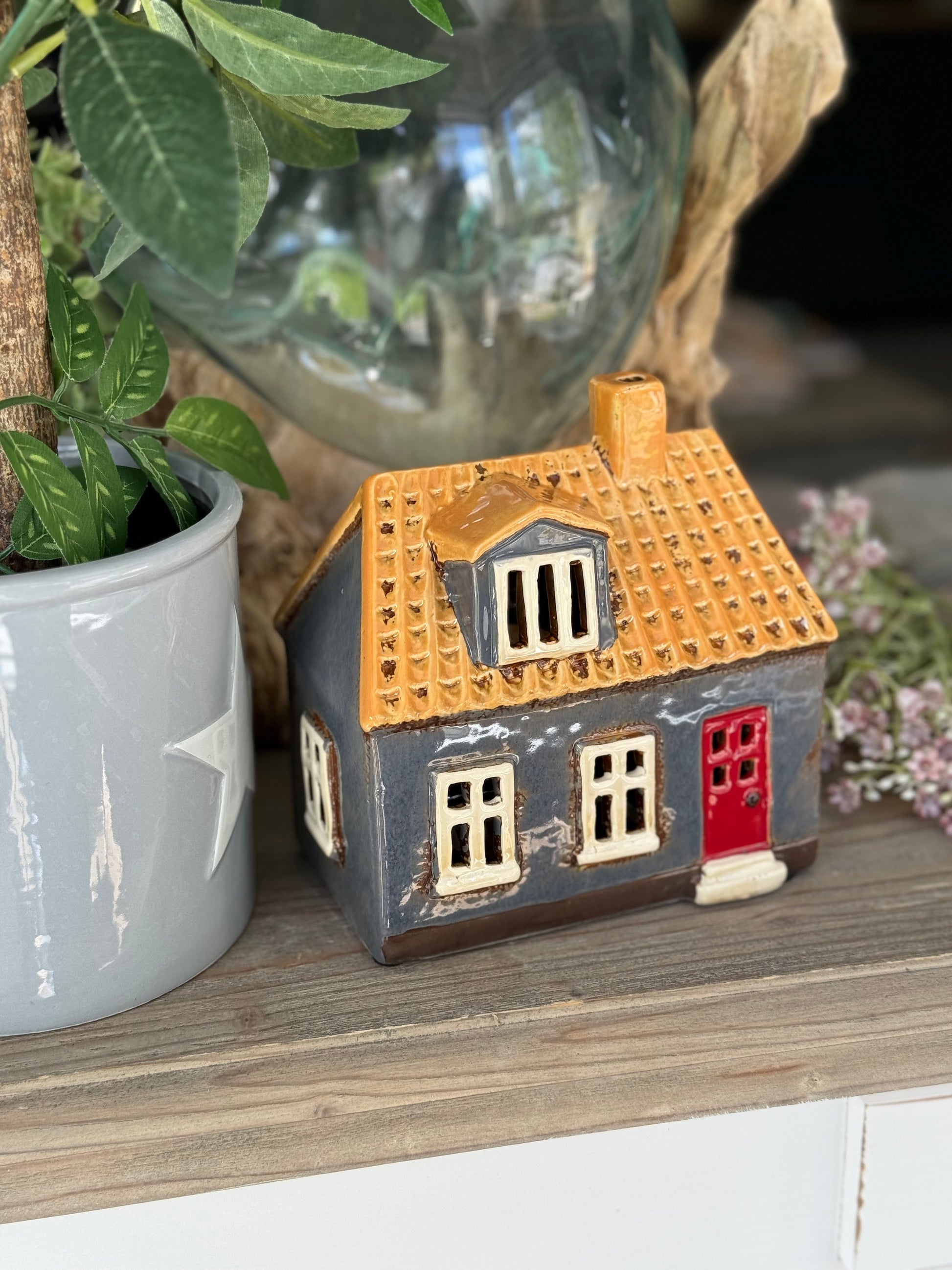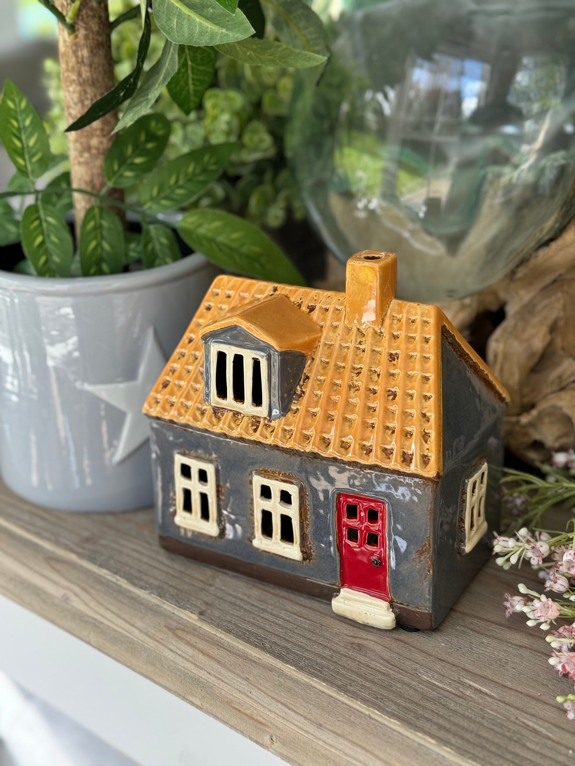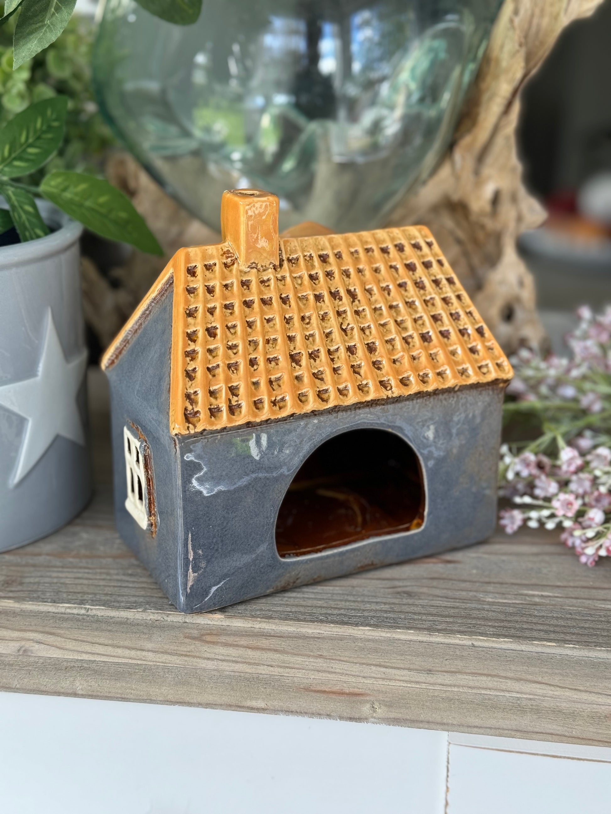 This gorgeous Grey ceramic tealight holder is the perfect way to create a cosy ambience in your own home. Finished with a mustard tiled roof, this charming farmhouse tealight will look lovely when displayed in your home.