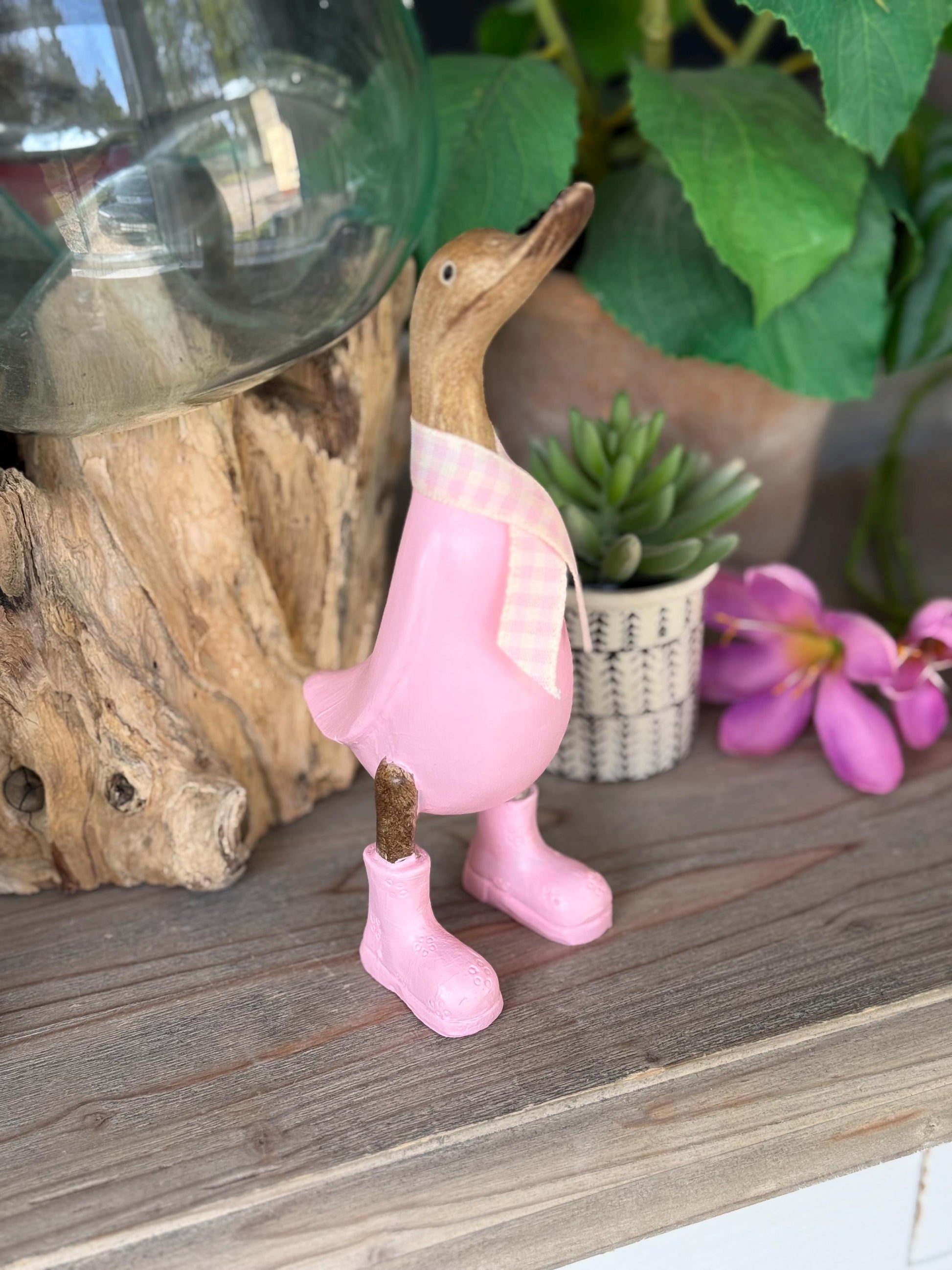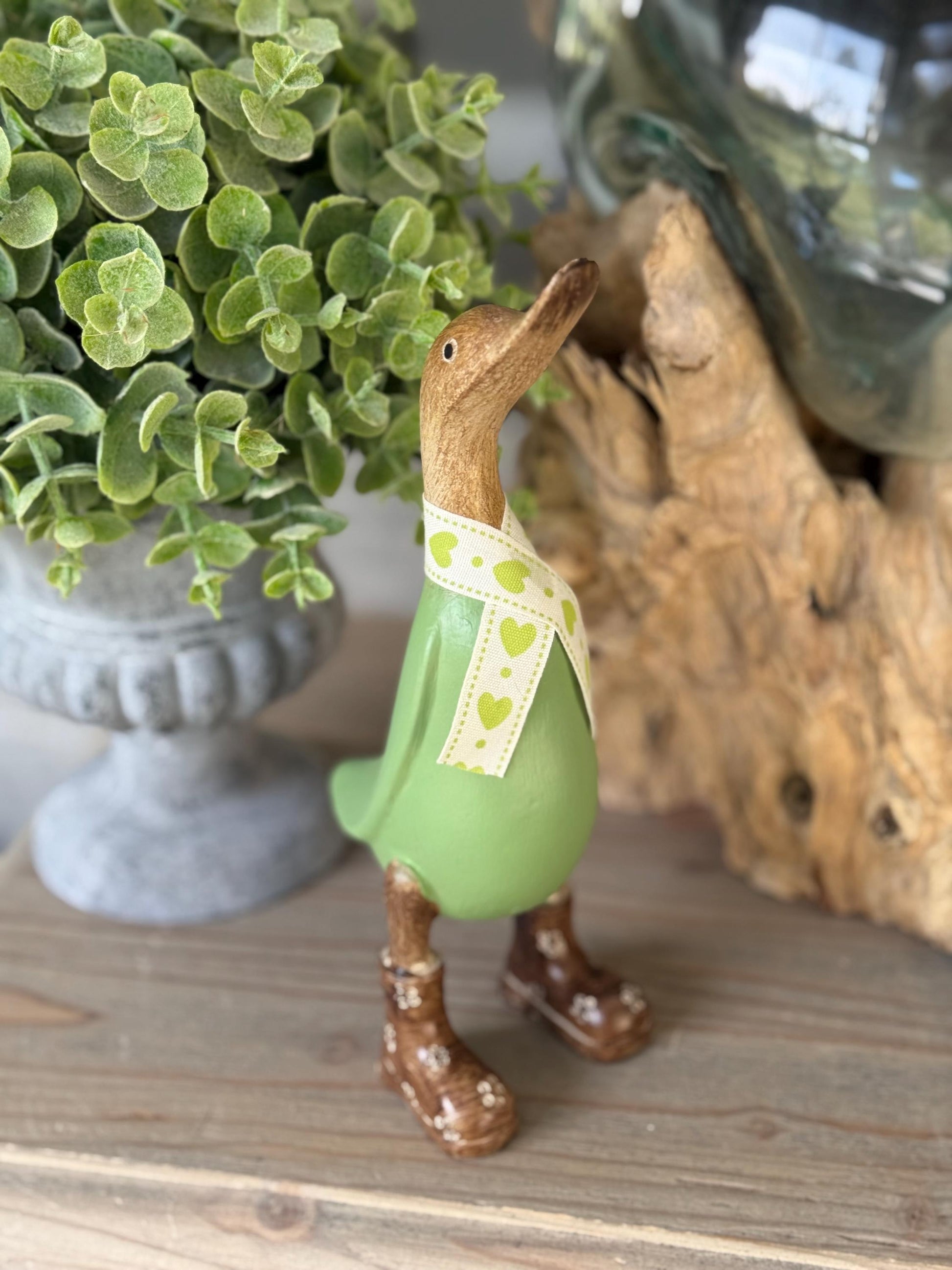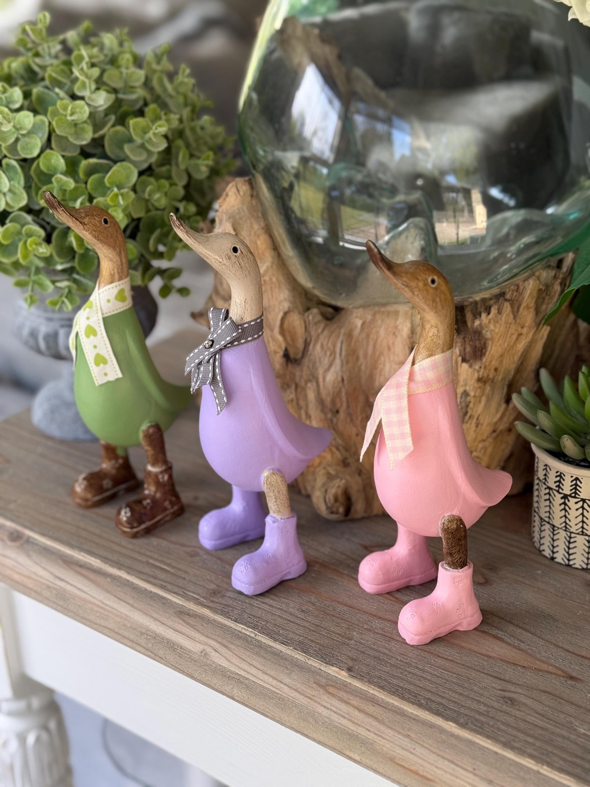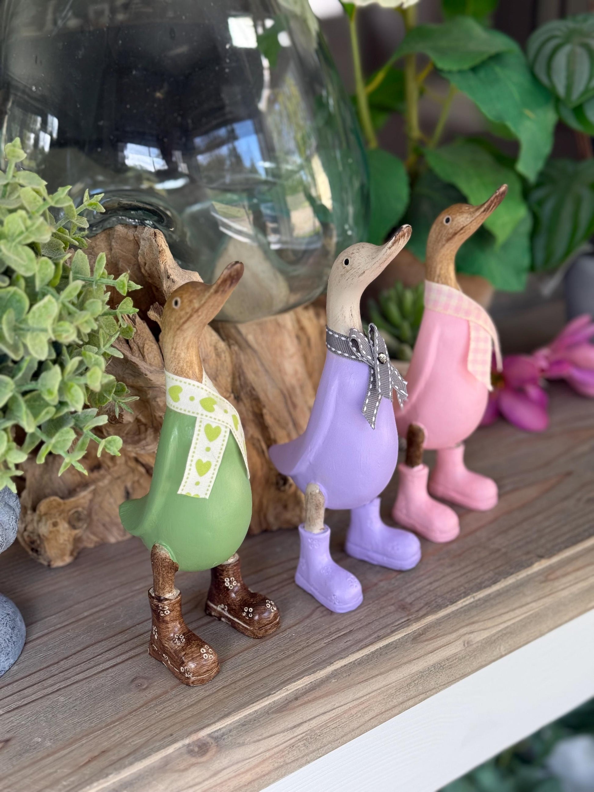 Very sweet ducks , hand-painted in a selection of colours finished with a ribbon and painted boots. Each sold individually
