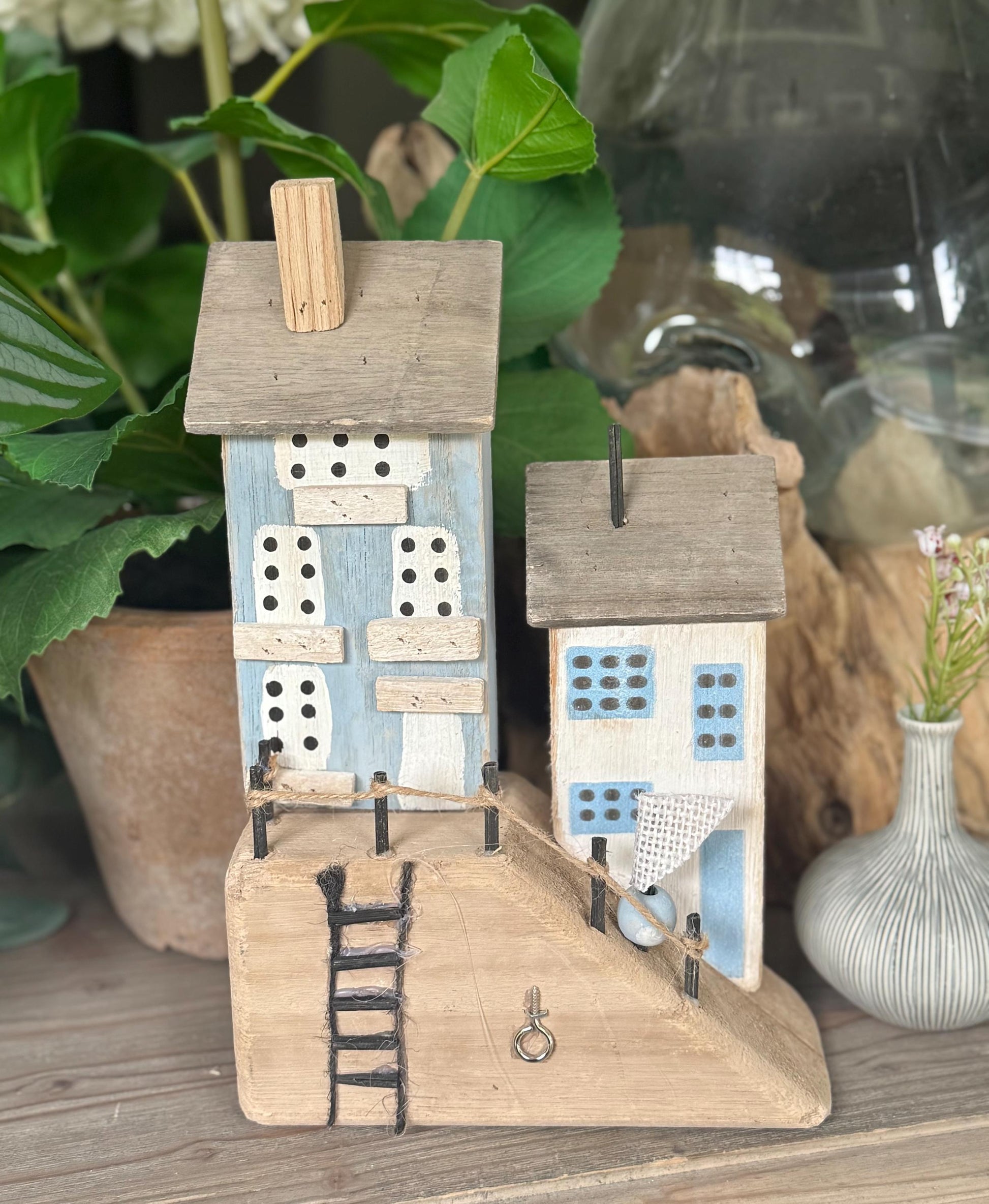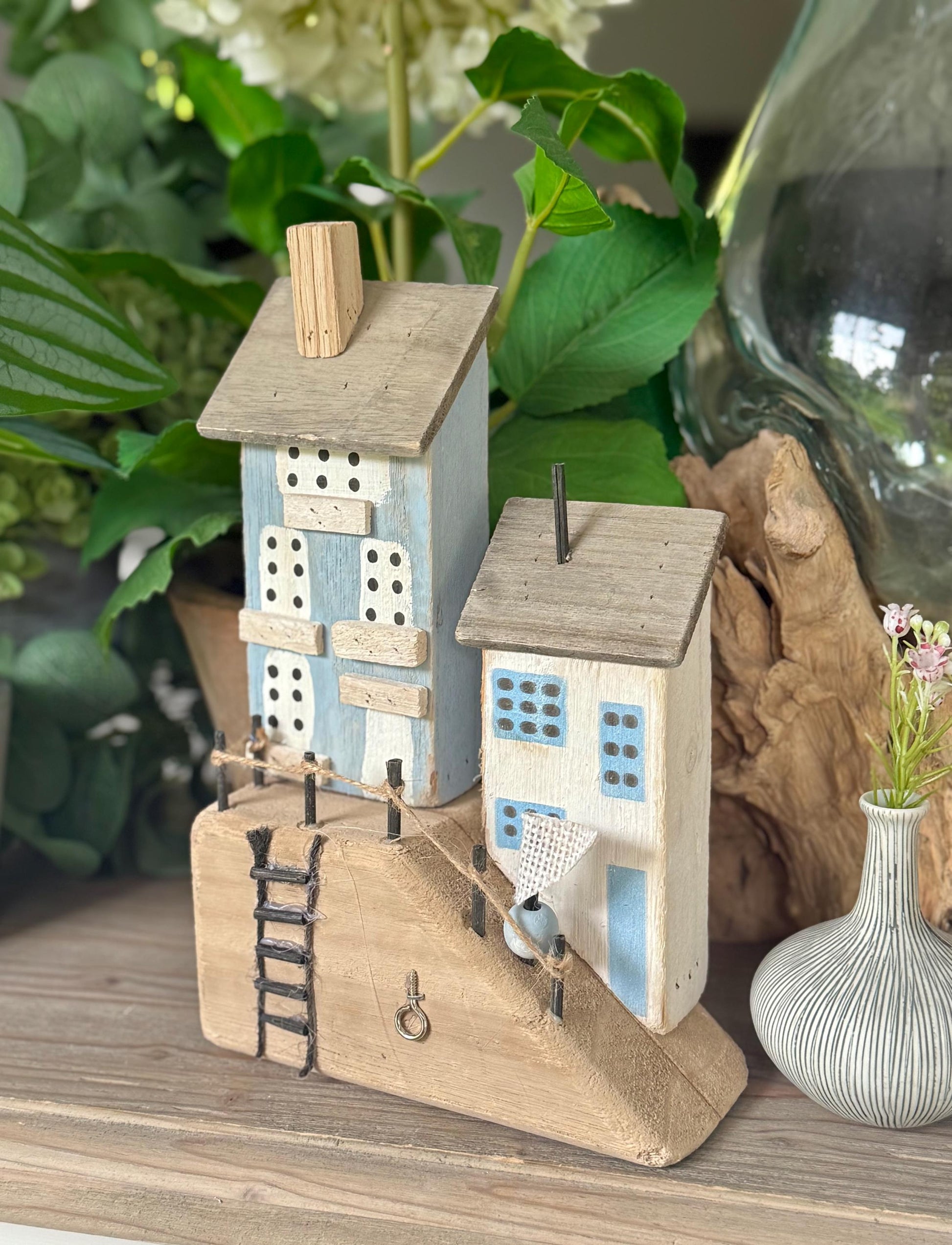 Lovely contemporary wooden ornament with a cottage on the edge of a harbour featuring two cottages on a hill and a string ladder.