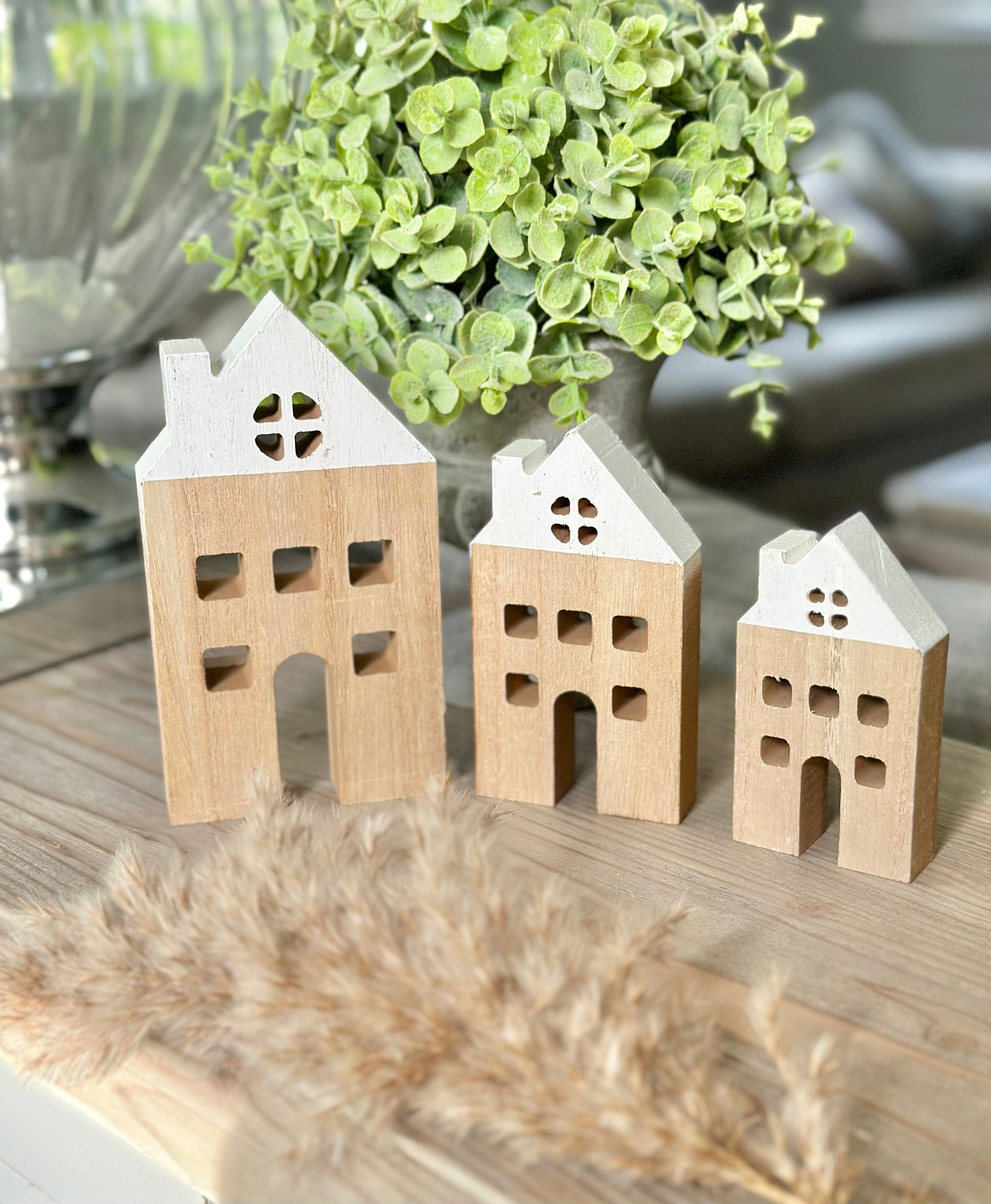 A gorgeous set of 3 wooden houses with white roofs and cut out windows and doors. Perfect simple charm for creating that cosy decorative design. Wrapped and delivered in a hessian bow. Ideal as a gift.