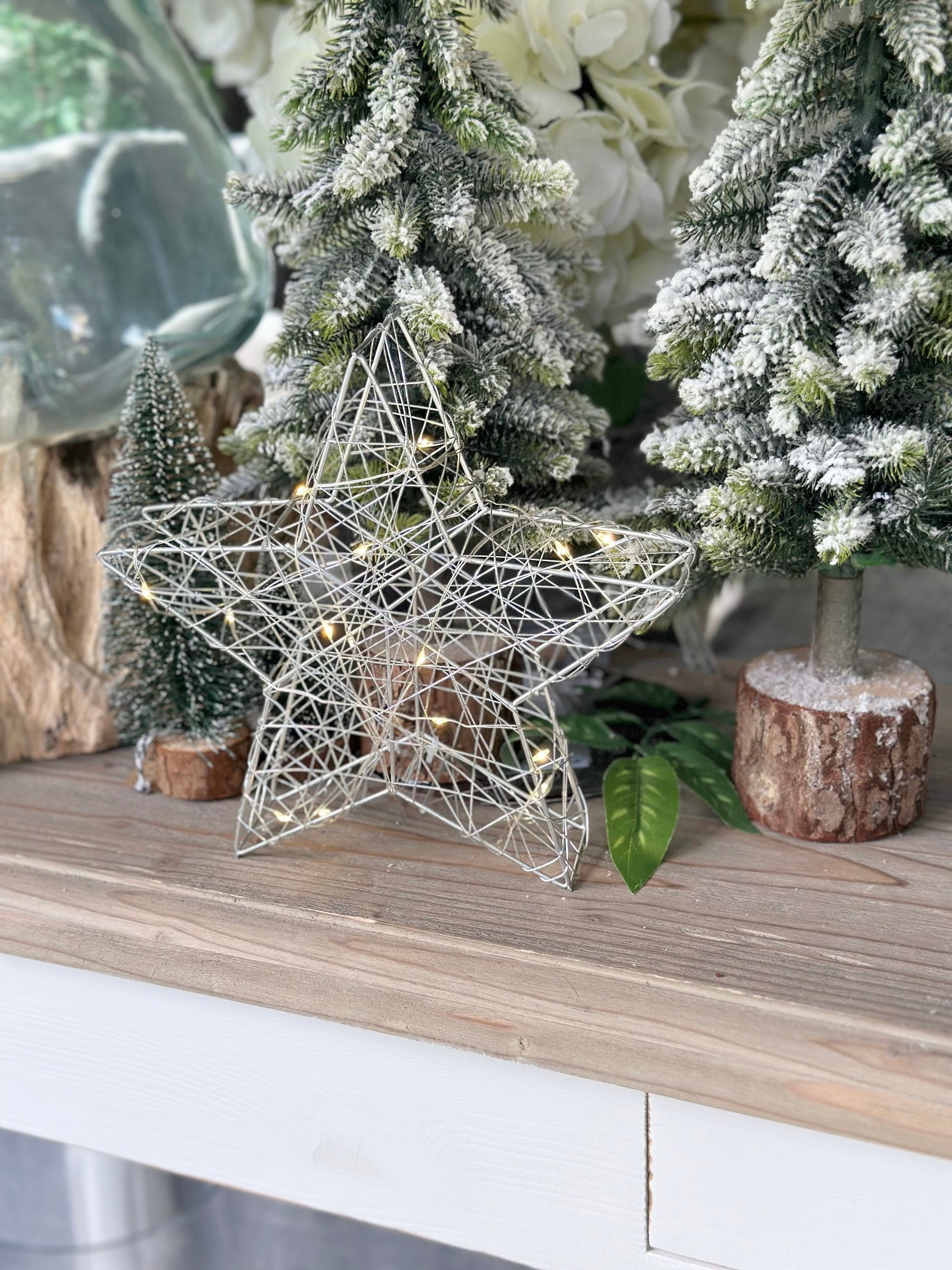 A beautiful three-dimensional, free standing silver star decoration with warm glow LED micro lights.