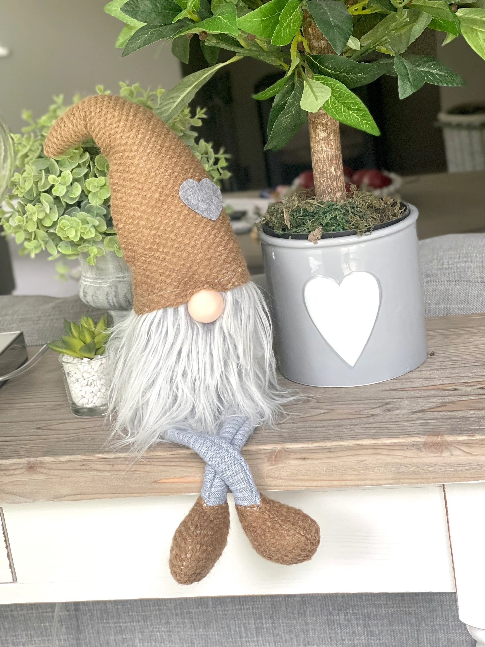 A fun themed shelf sitting gonk with a love heart hats and dangly legs.