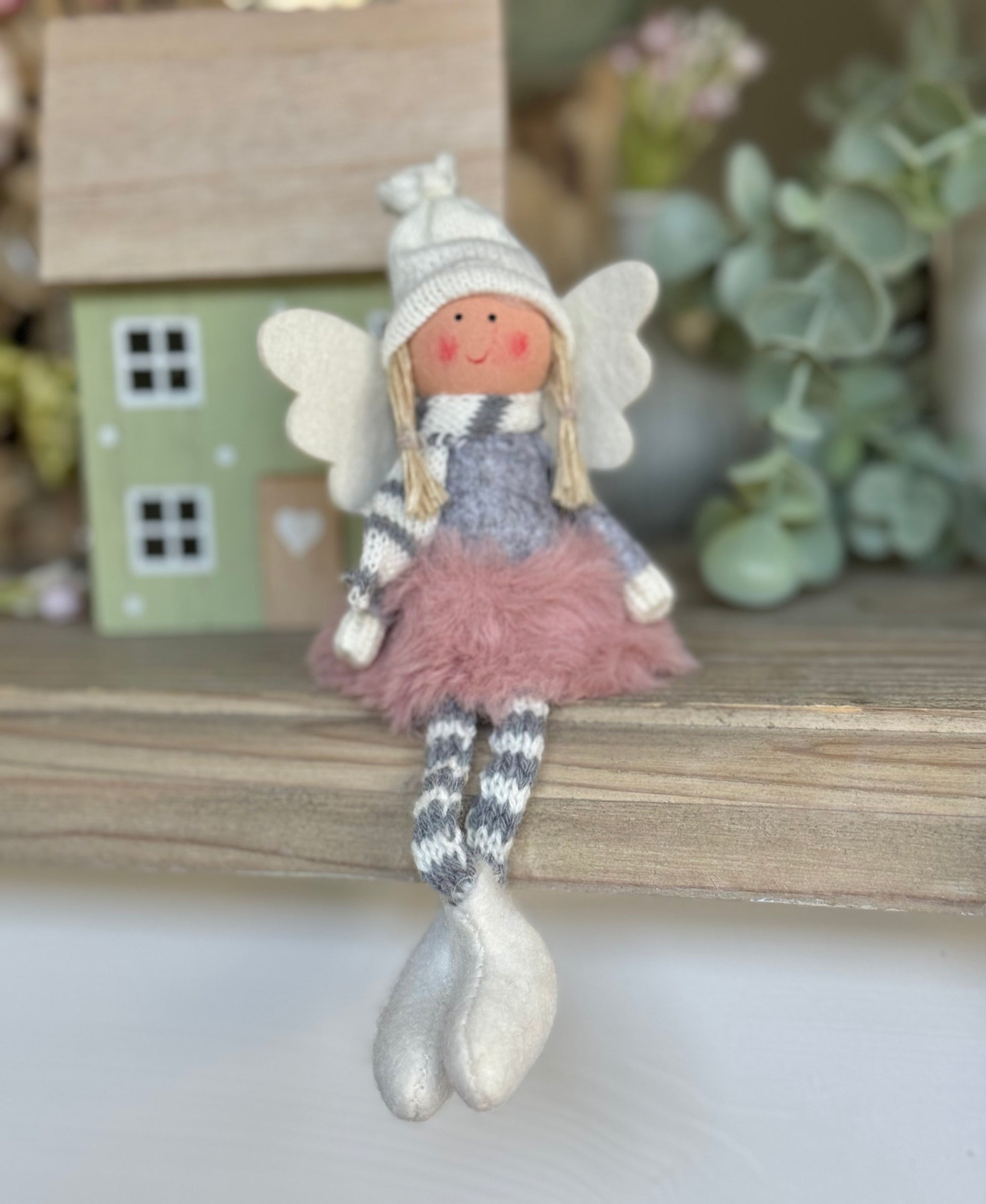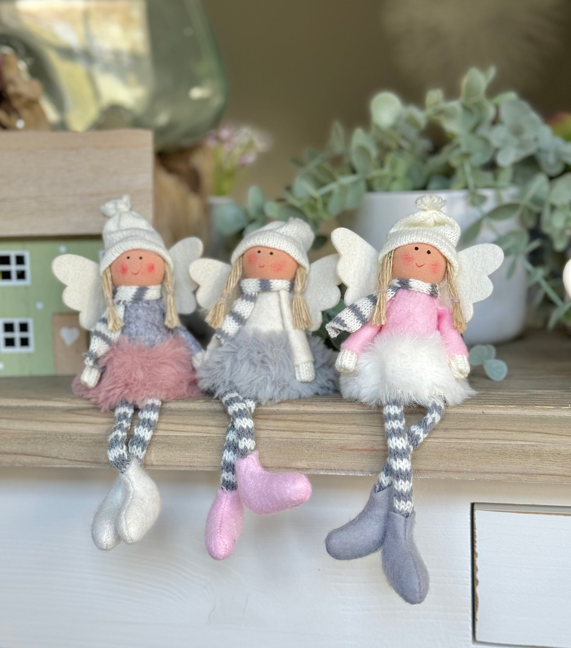 They are so sweet and look absolutely perfect in any room. They sit and dangle their feet over a shelf, mantle, or bookcase, the list is endless! All have cute white wings and are finished with striped leggings, a scarf and beige woolly booties.