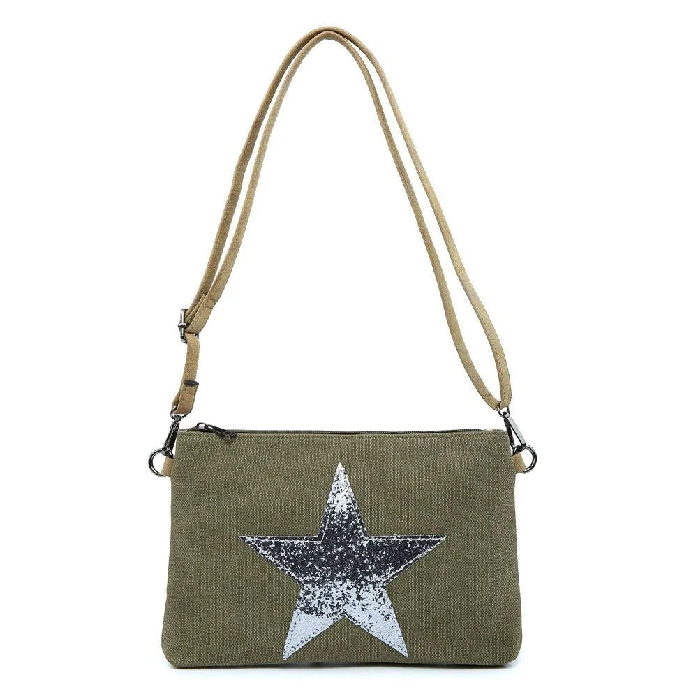 Khaki Green Flat Star Canvas Clutch/Crossbody with Strap