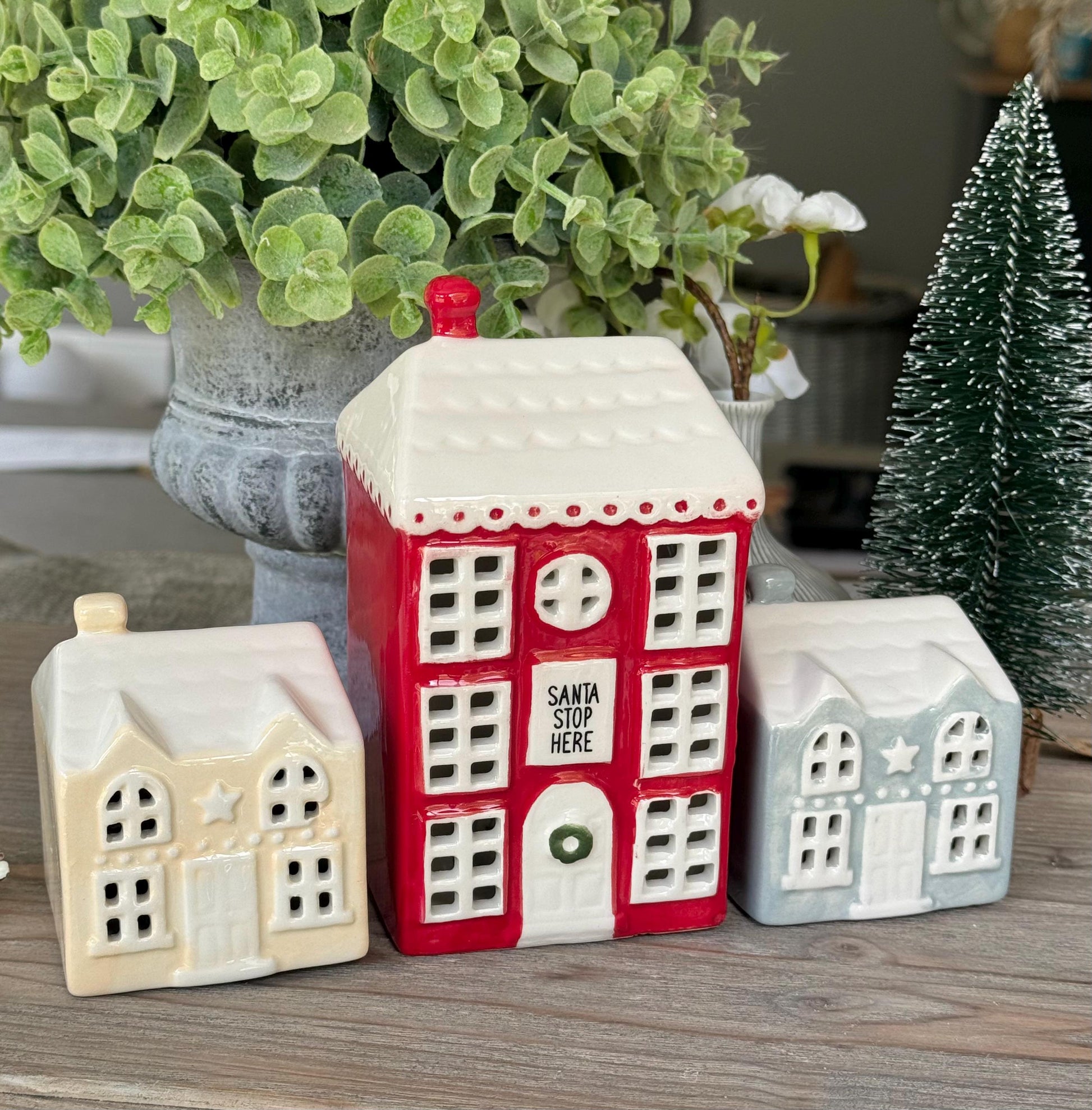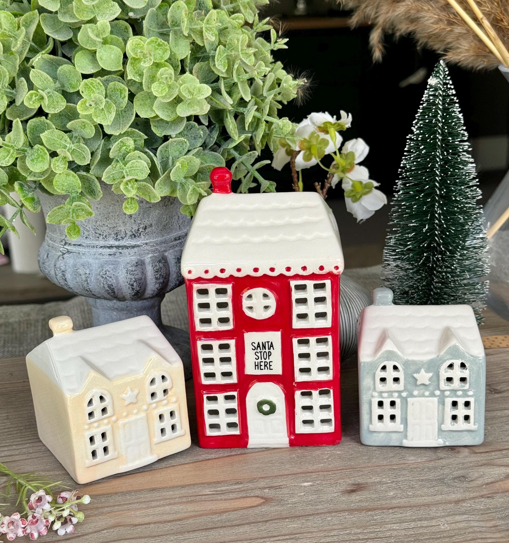 Turn on the charm this Christmas with this trio of ceramic houses that light up from within. Display together to create a sweet village scene or place throughout the home for some festive cheer. Sold as a set of 3 houses. LED lights with bottom on/off switch
