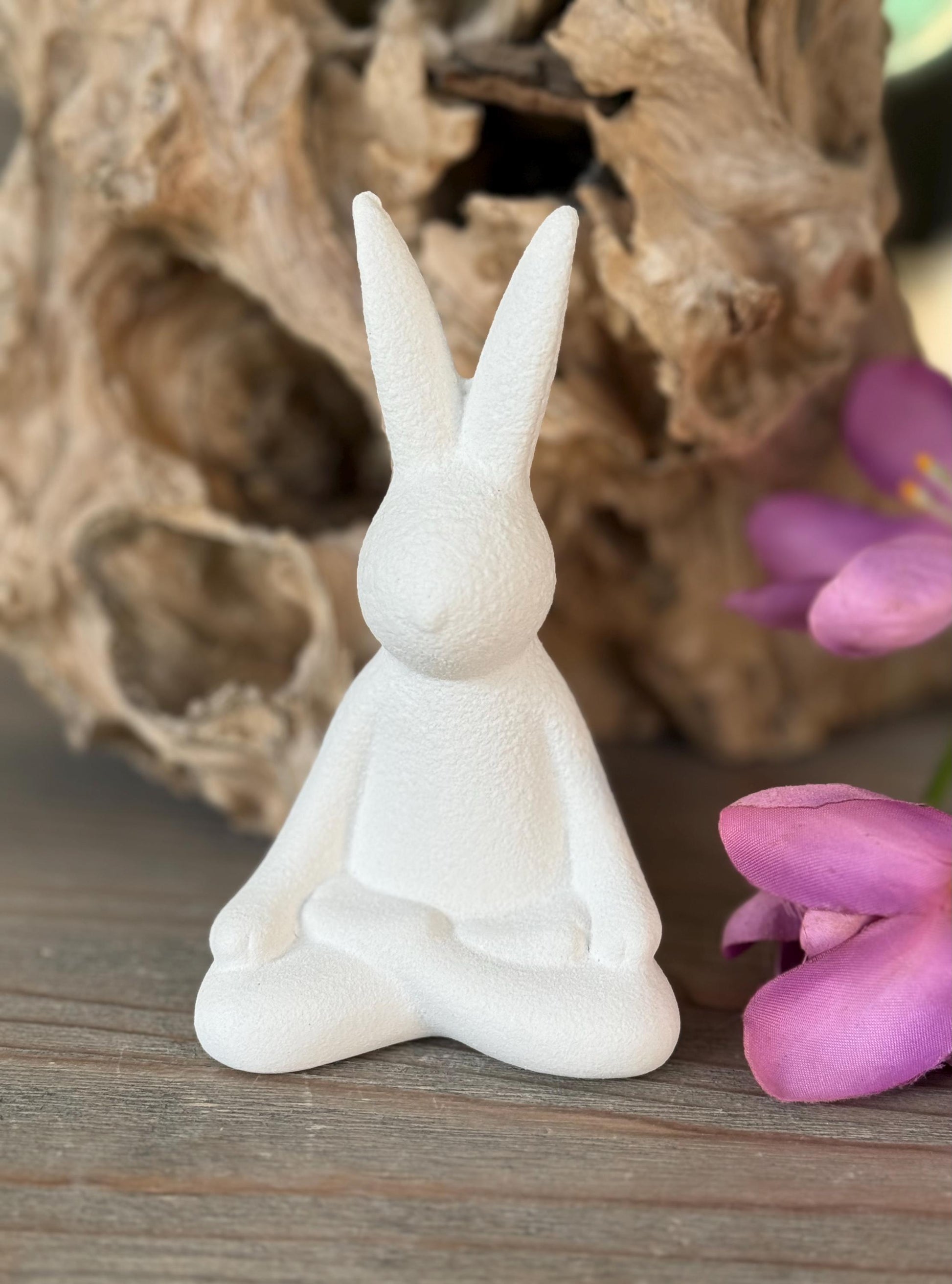 An adorable white yoga bunny ornament finished with a grey heart. A simple yet sweet decorative accessory and gift item.