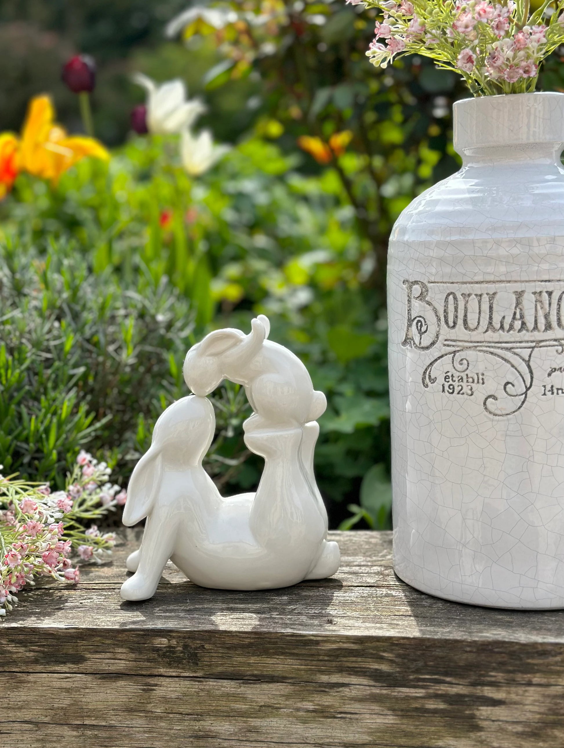 An adorable sitting kissing bunny ornament with a glossy white finish. A simple yet sweet decorative accessory and gift item.