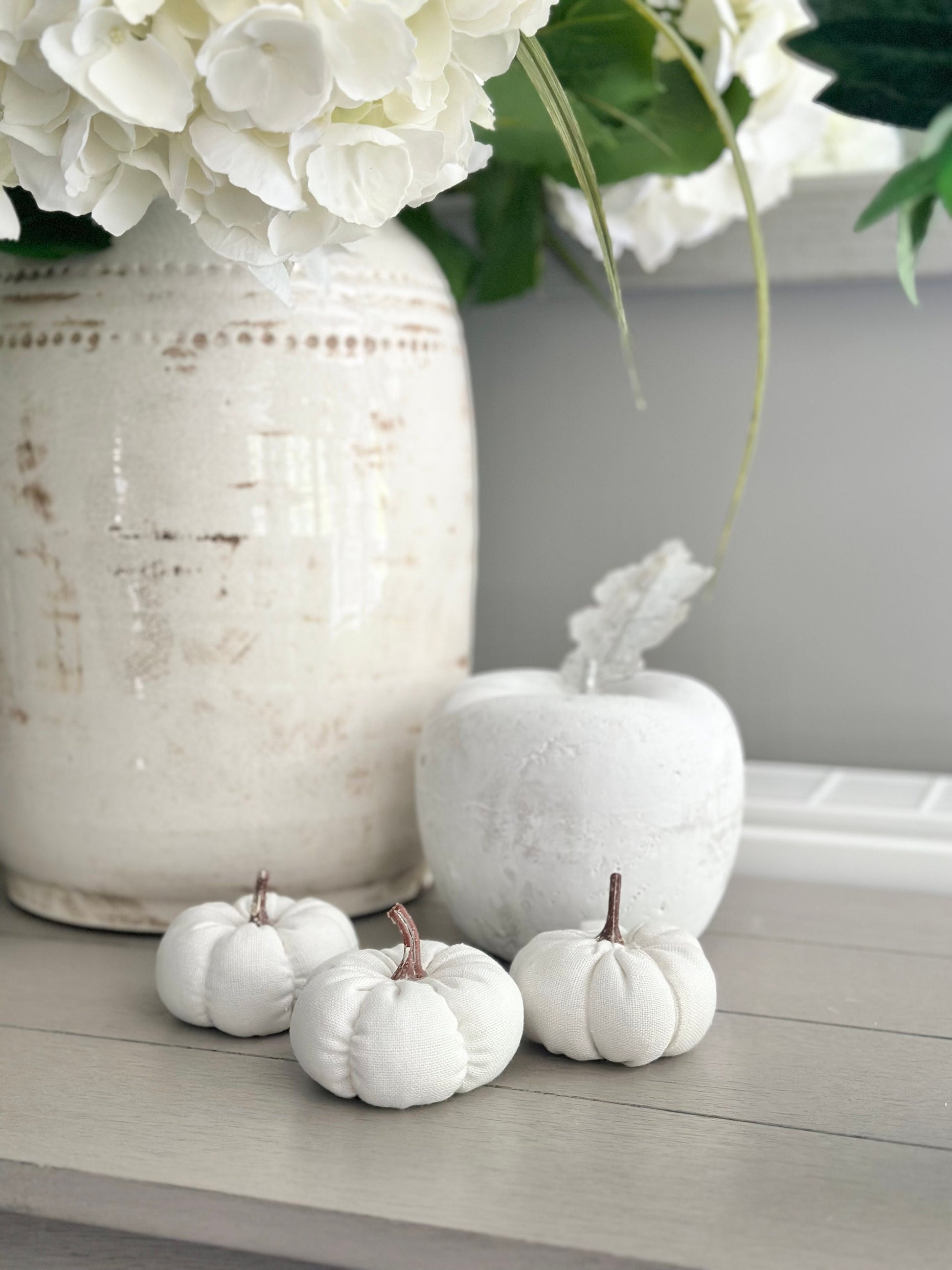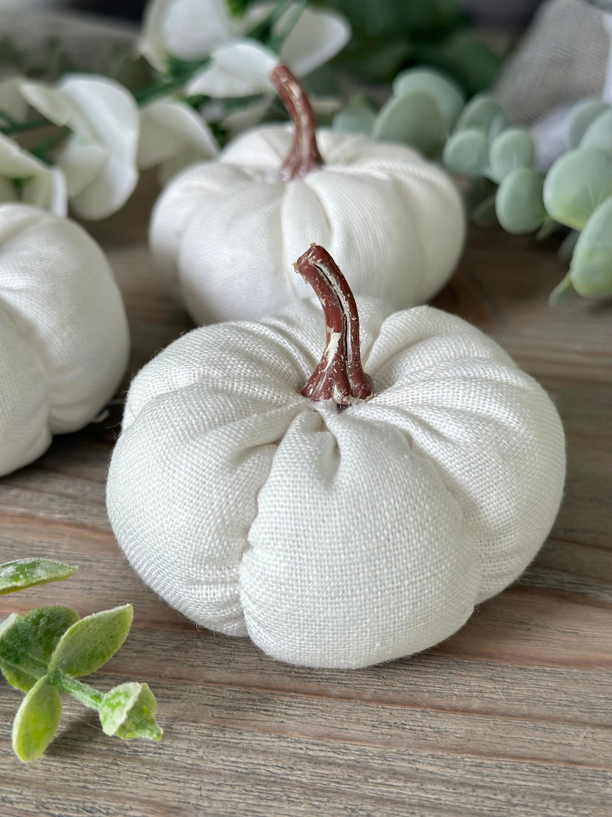 A charming set of 3 white linen pumpkins with bronzed stalks. A perfect addition to any autumnal display.