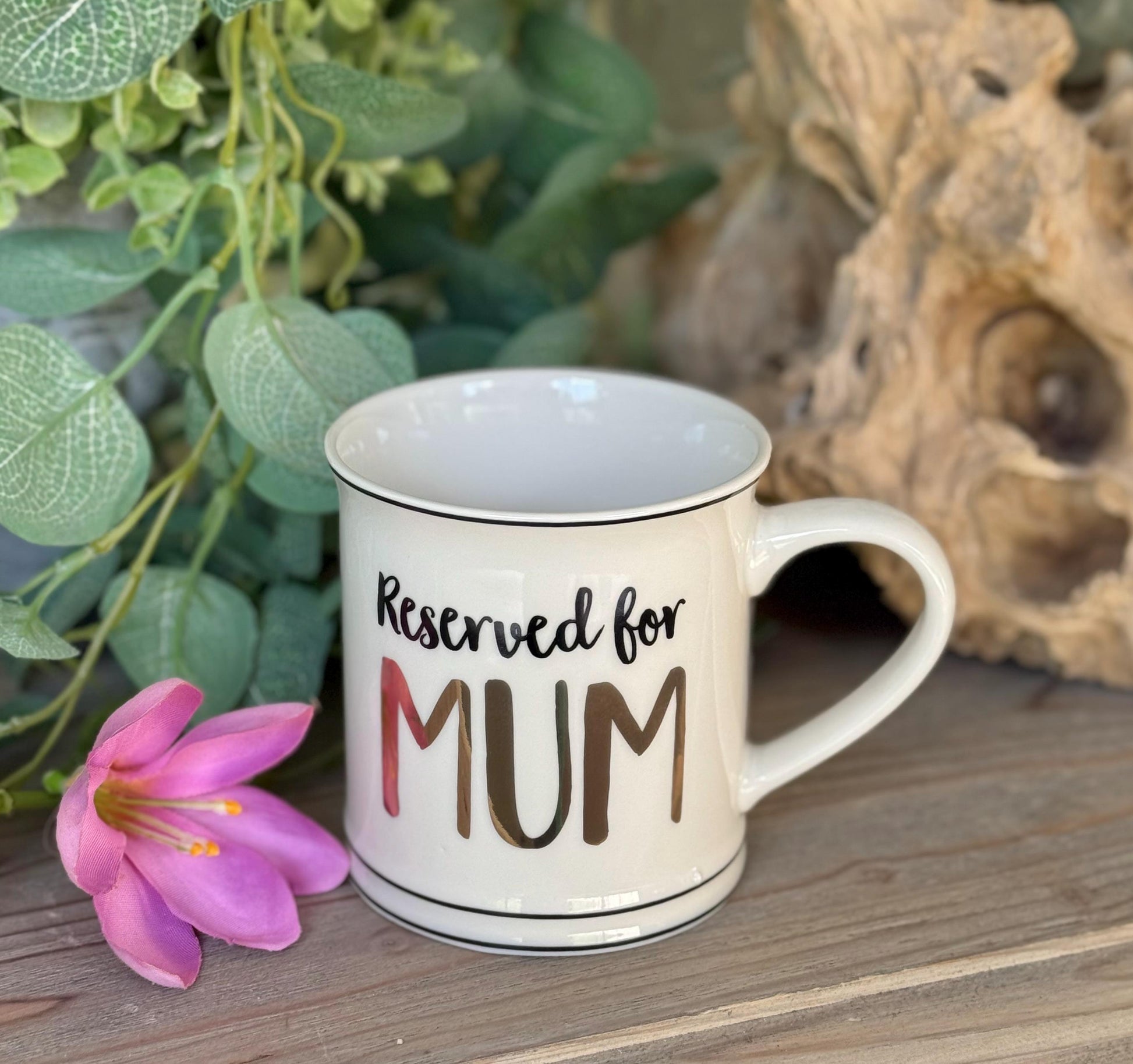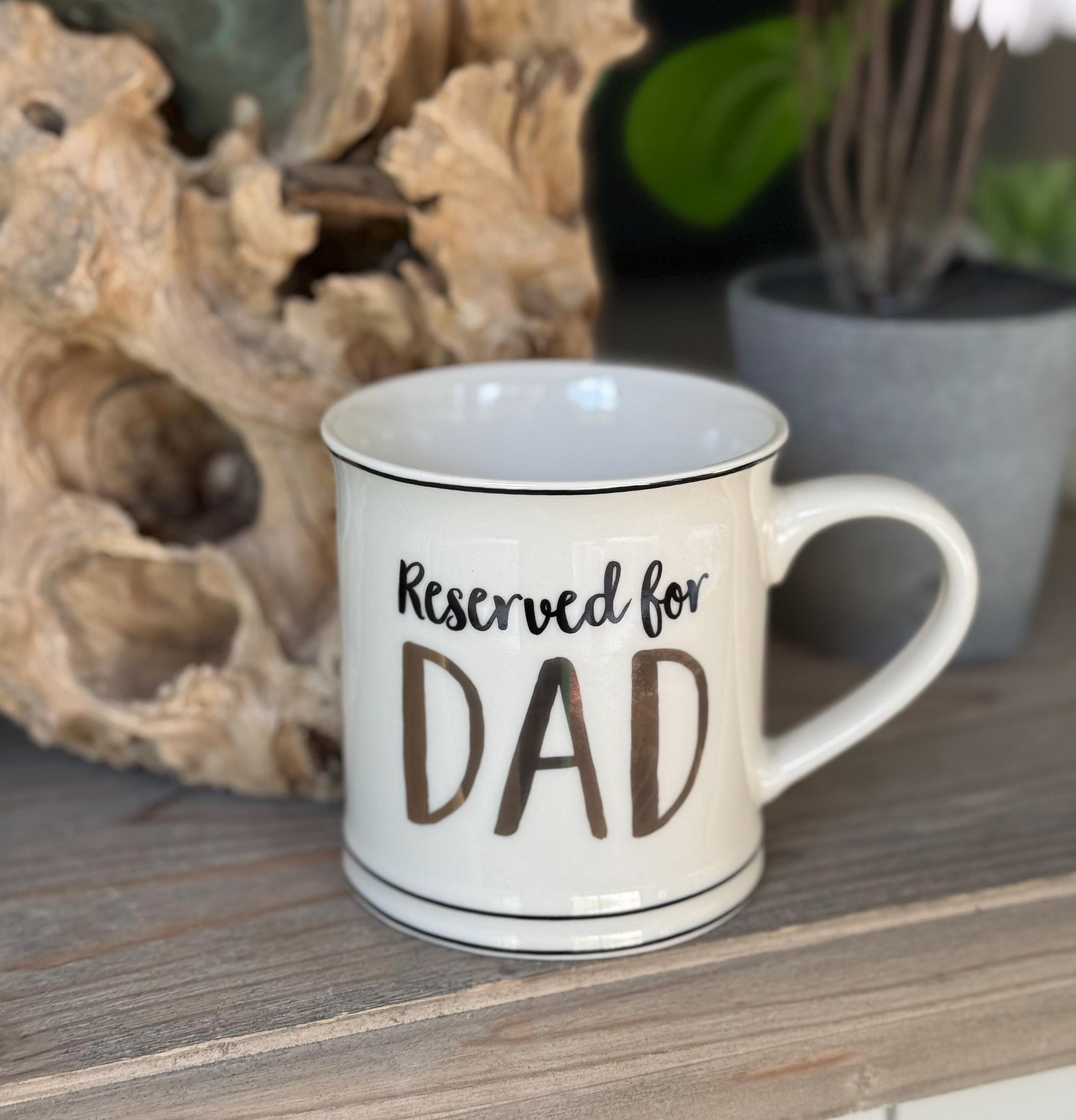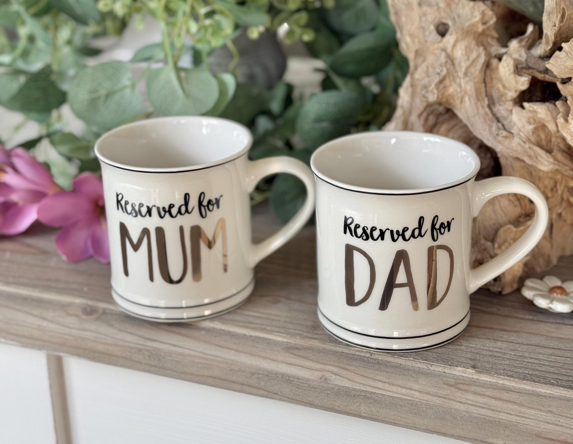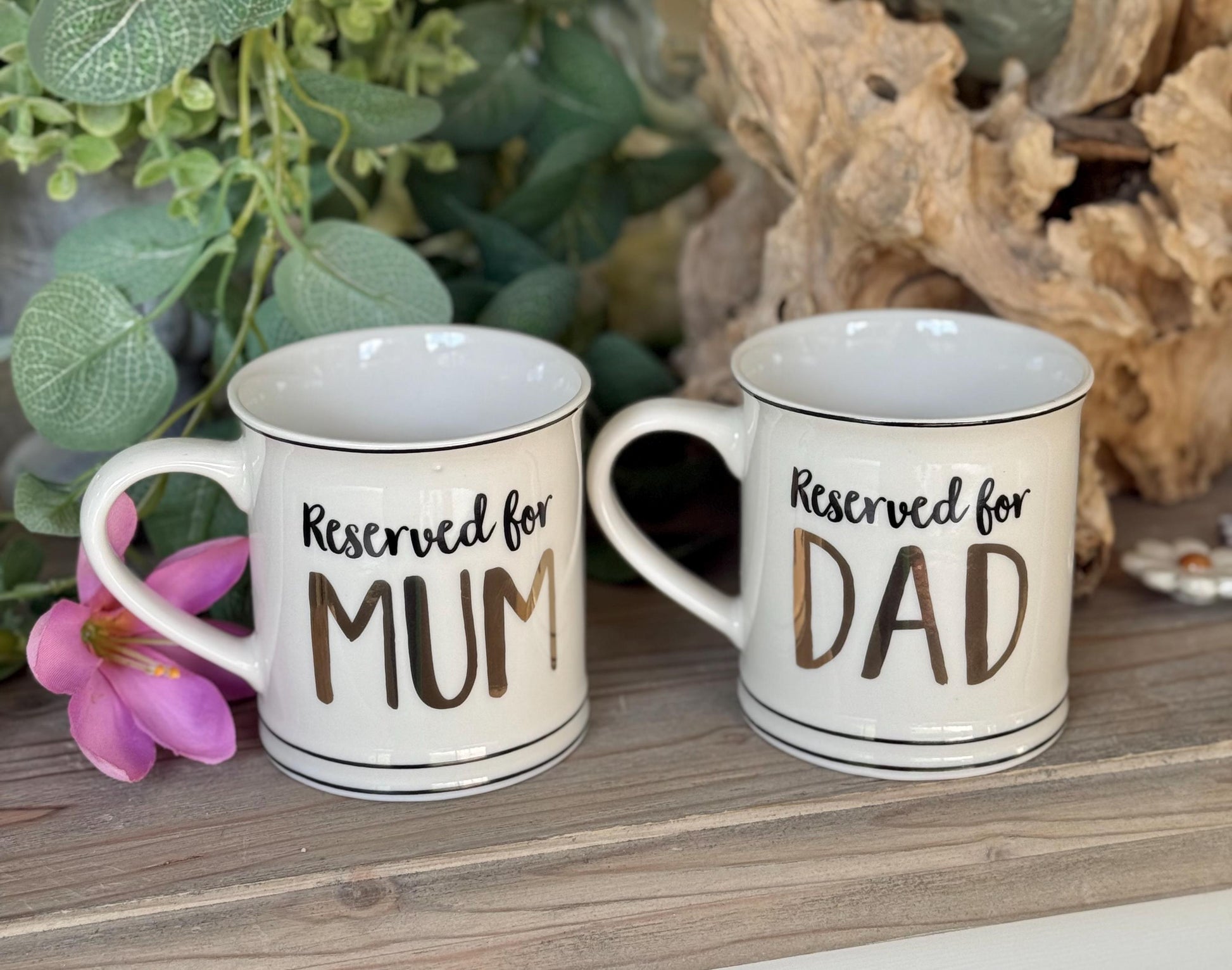 A classic mug design, each featuring a white background with beautiful black typography saying either 'Reserved for Mum' or 'Reserved for Dad'. Embossed on both sides of the mugs.