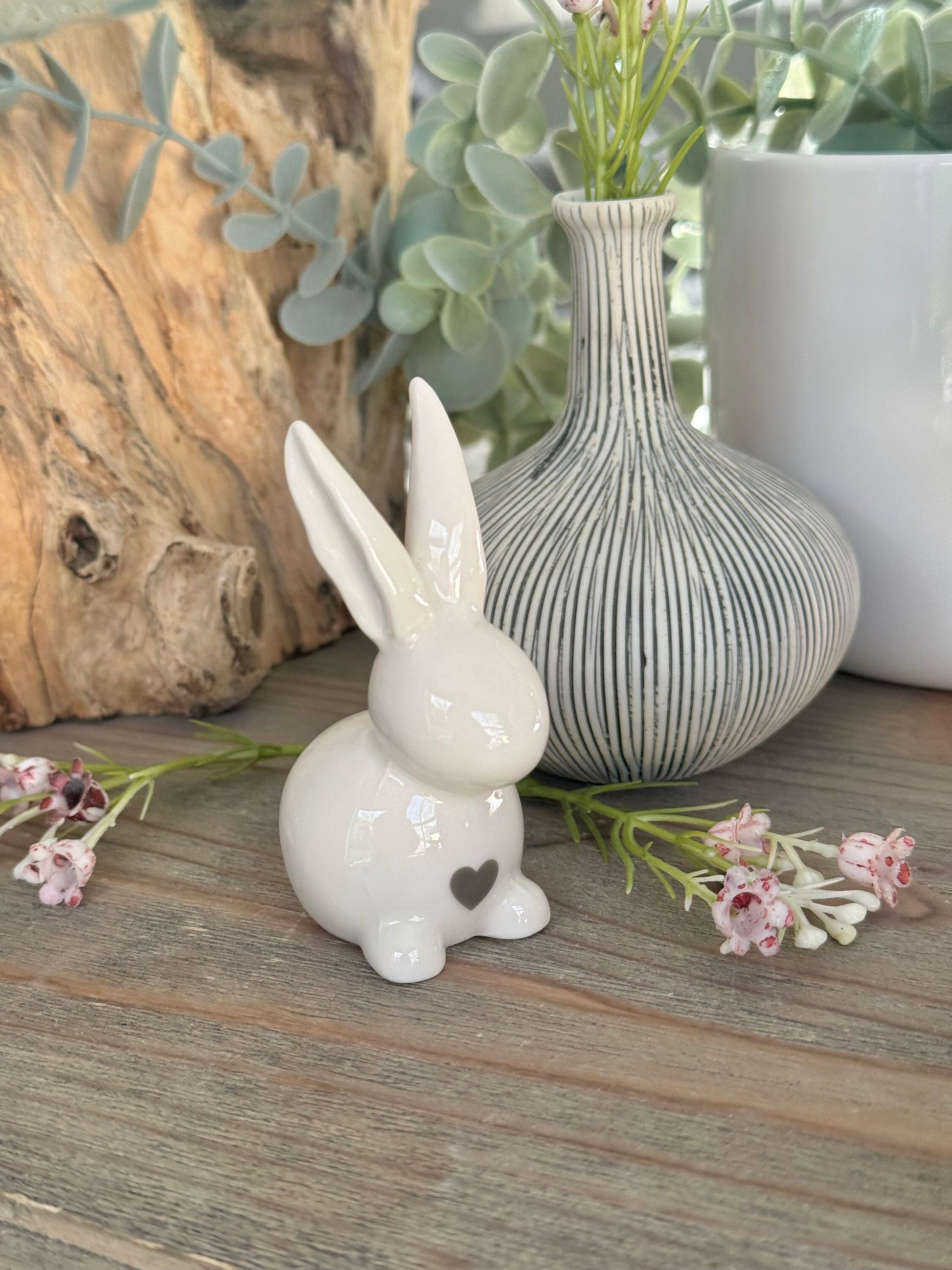 An adorable white glossy bunny ornament finished with a grey heart. A simple yet sweet decorative accessory and gift item.