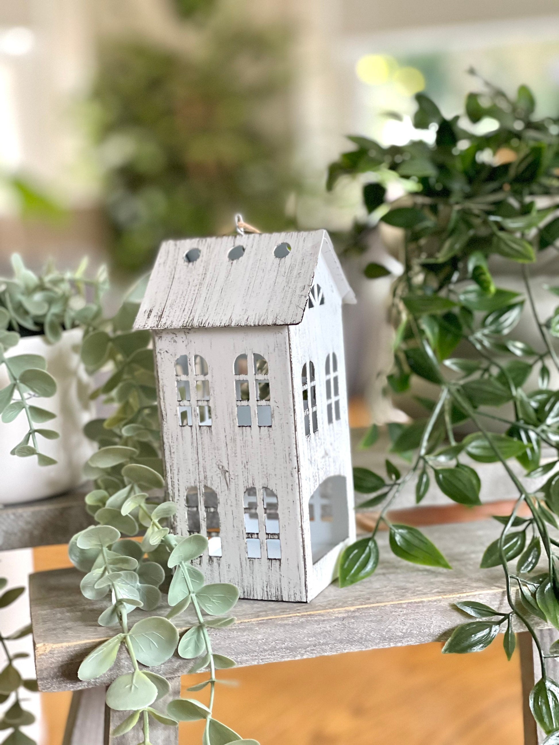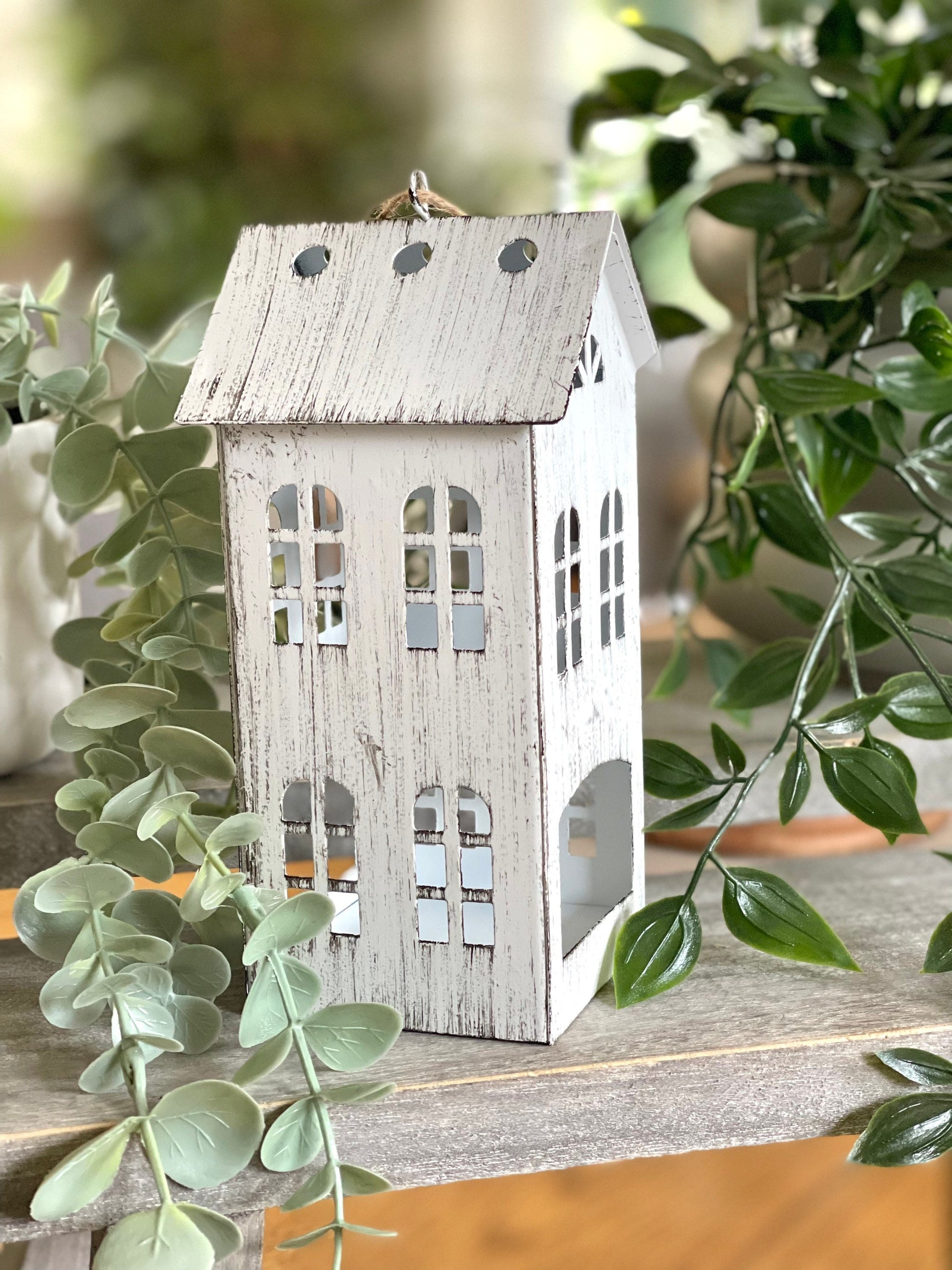 White Metal Tea Light House with cutout windows which allows for a beautiful warm glow.