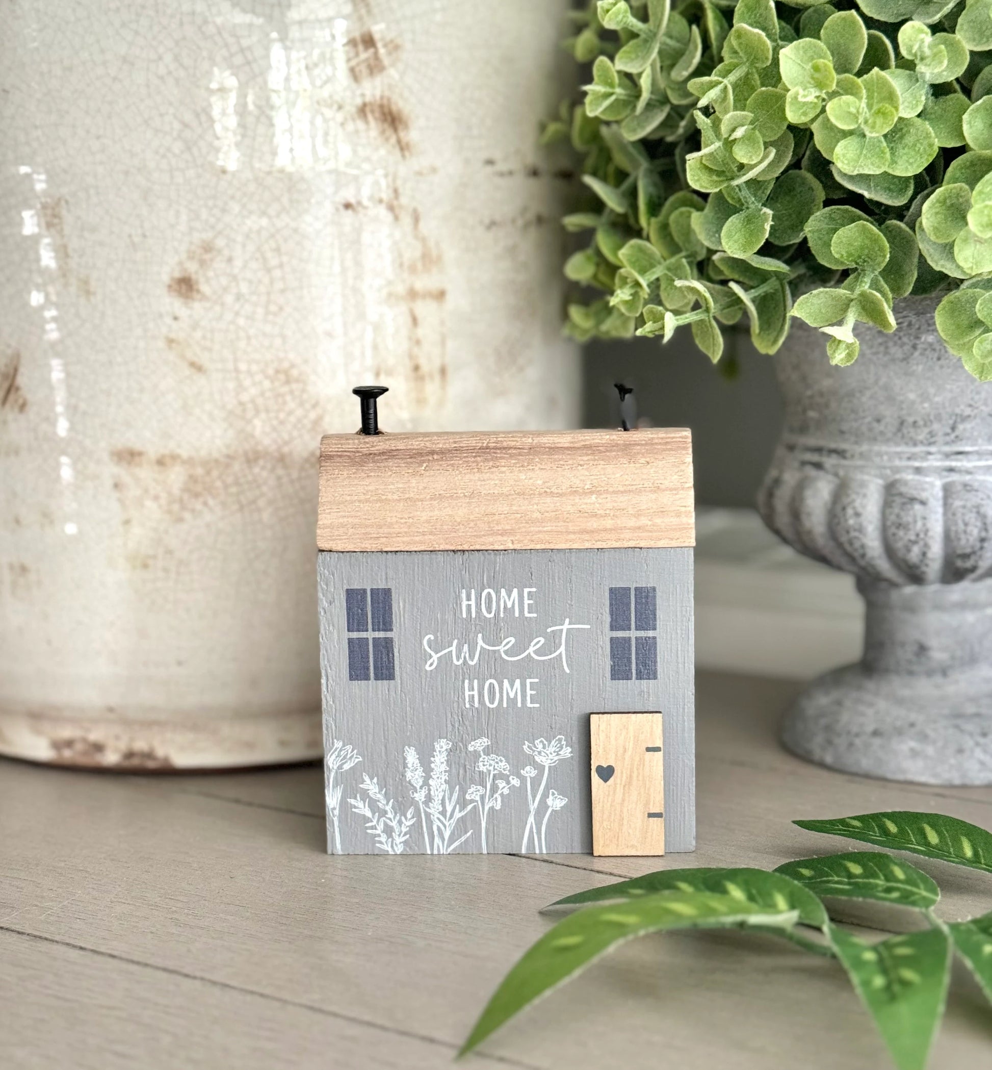A cute wooden house decoration with stylish grey colour scheme, 3D details and "home sweet home" message.
