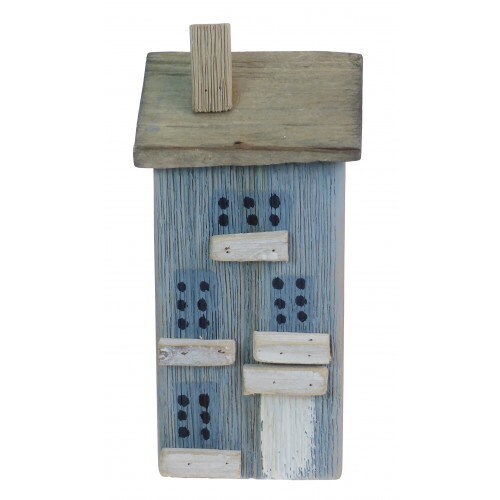 Finished with patterned windows and additional decal, this blue wooden house will blend in with any themed displays