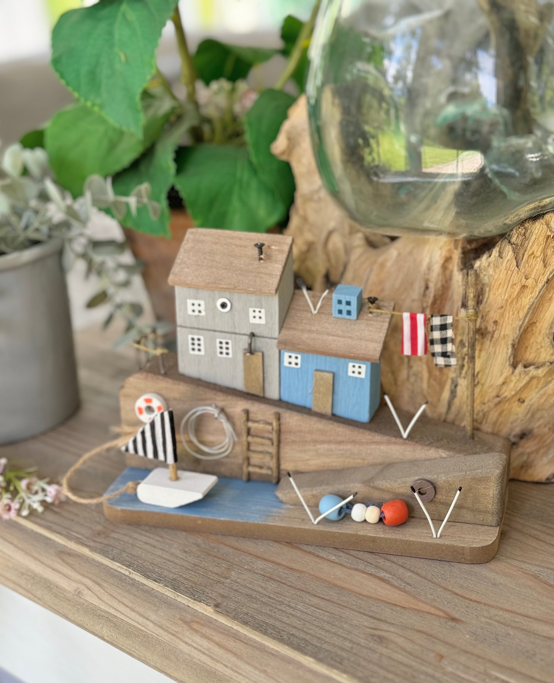 A lovely contemporary row of wooden cottages sitting on the edge of the harbour featuring a sailboat, bunting and lighthouse. Sweet colours of blue and white coastal cottages.